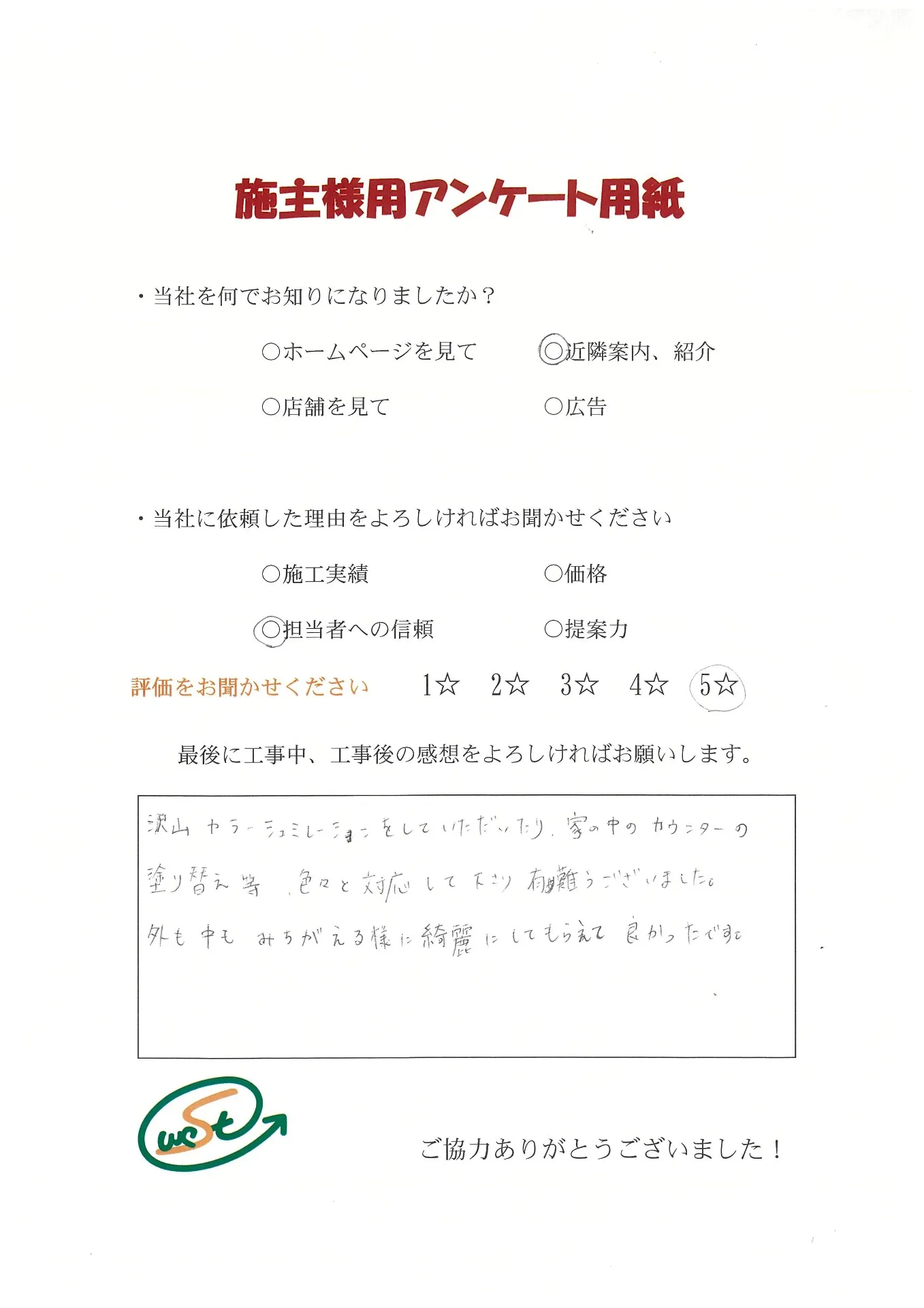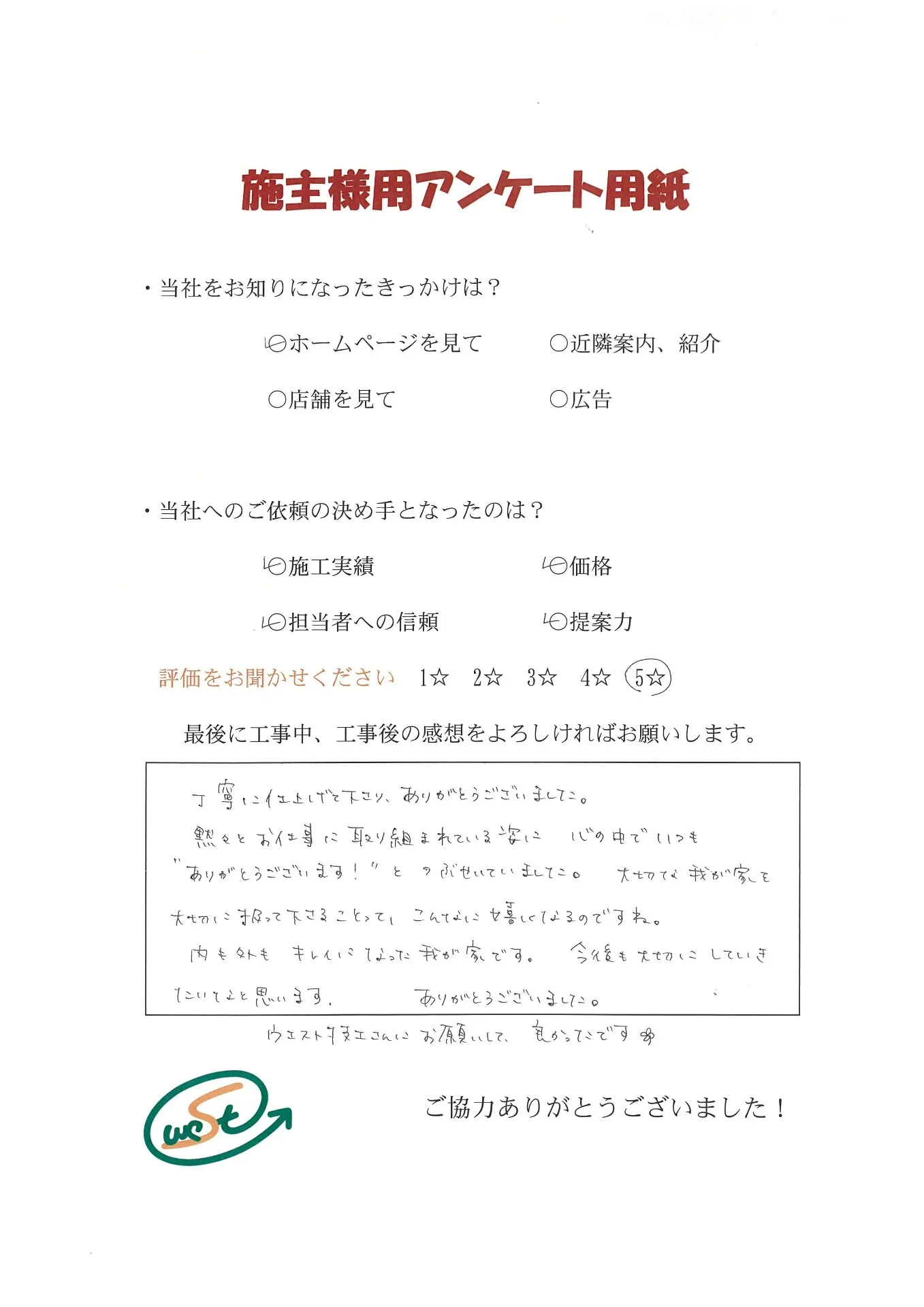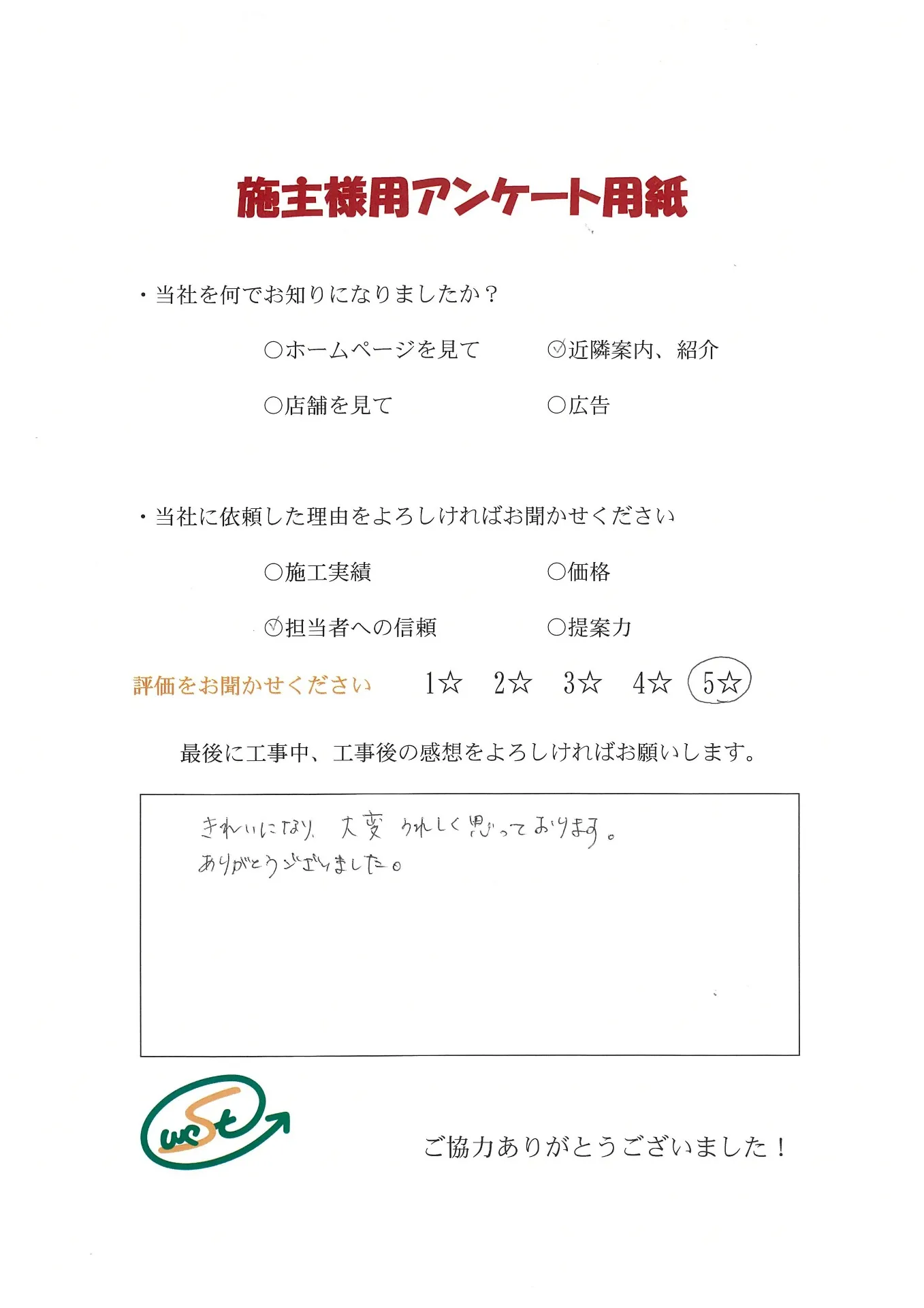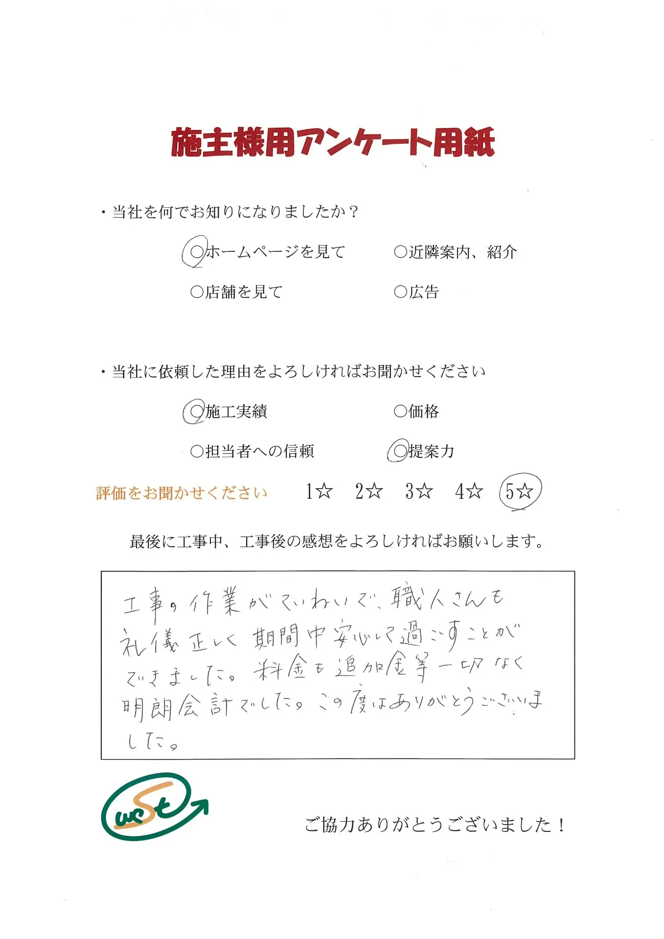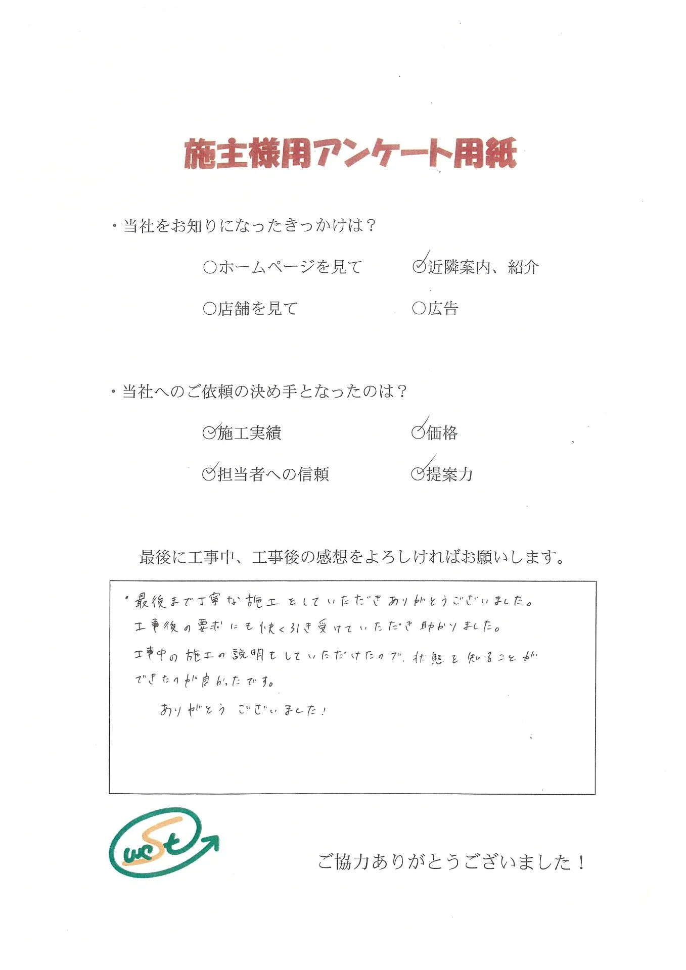 お客様から工事完了後のアンケート用紙をいただきました