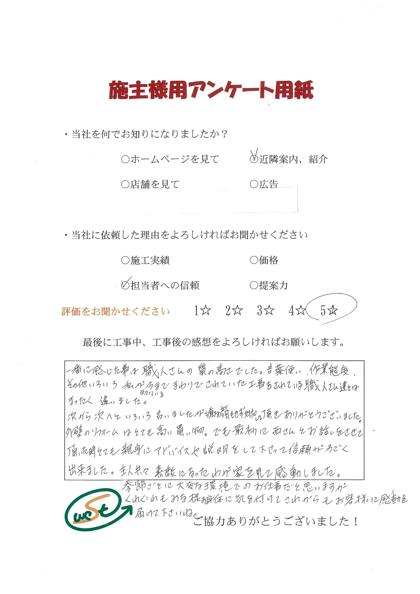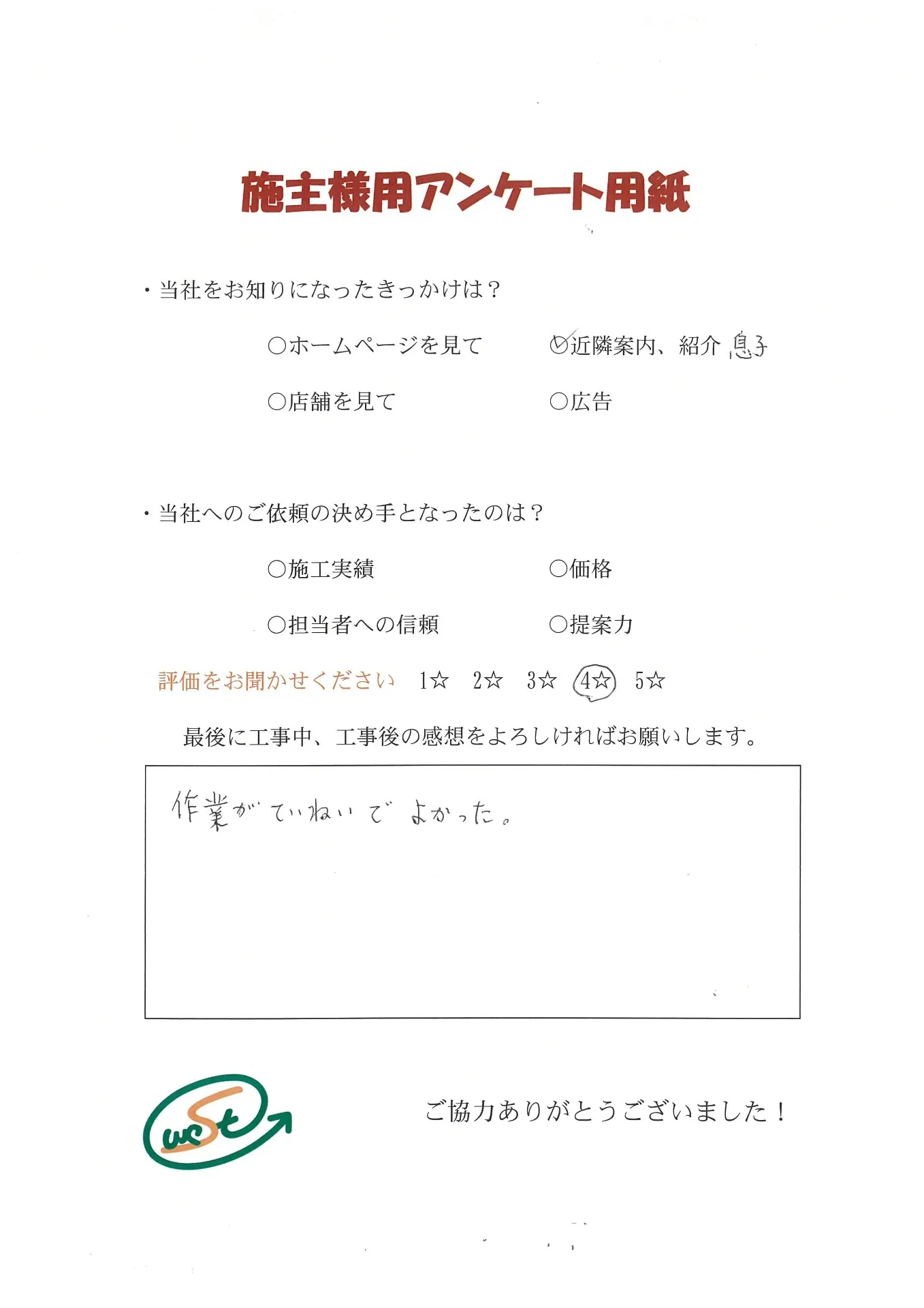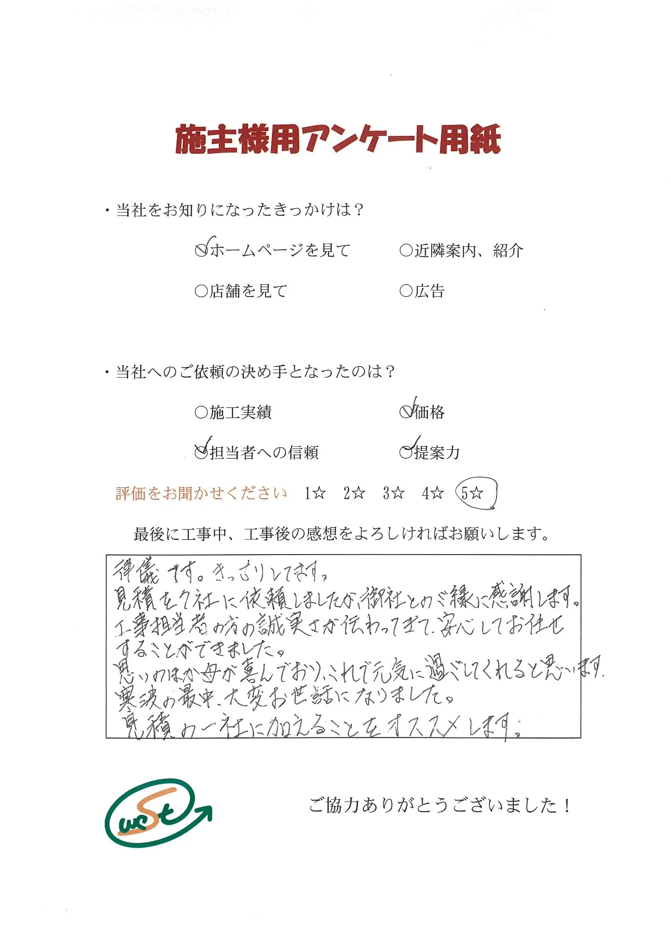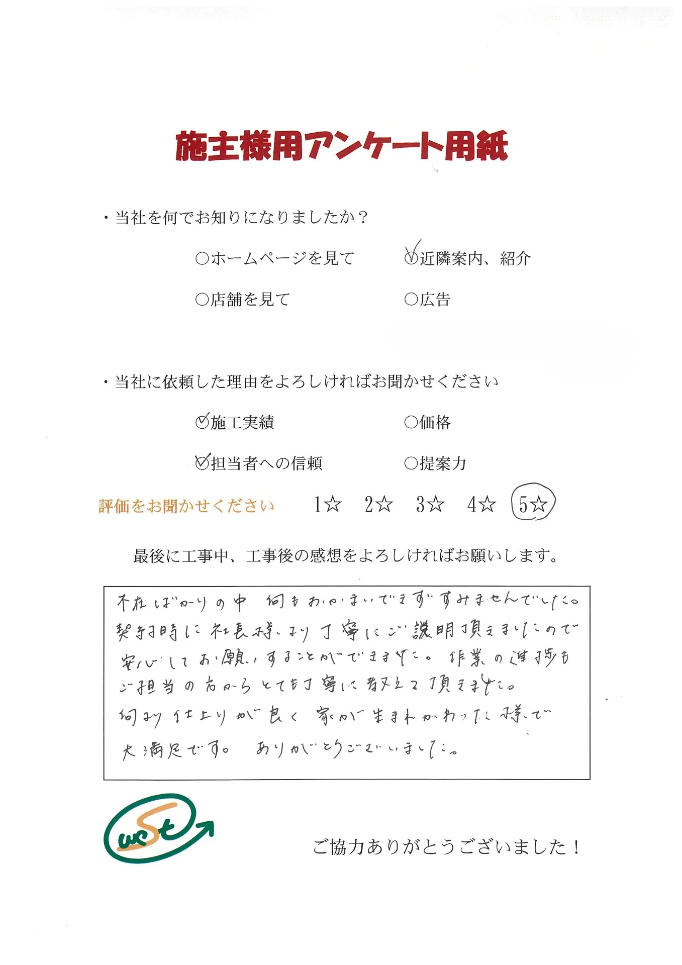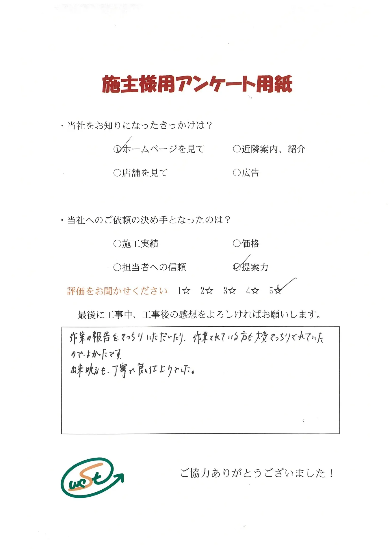 お客様から工事完了後のアンケート用紙をいただきました