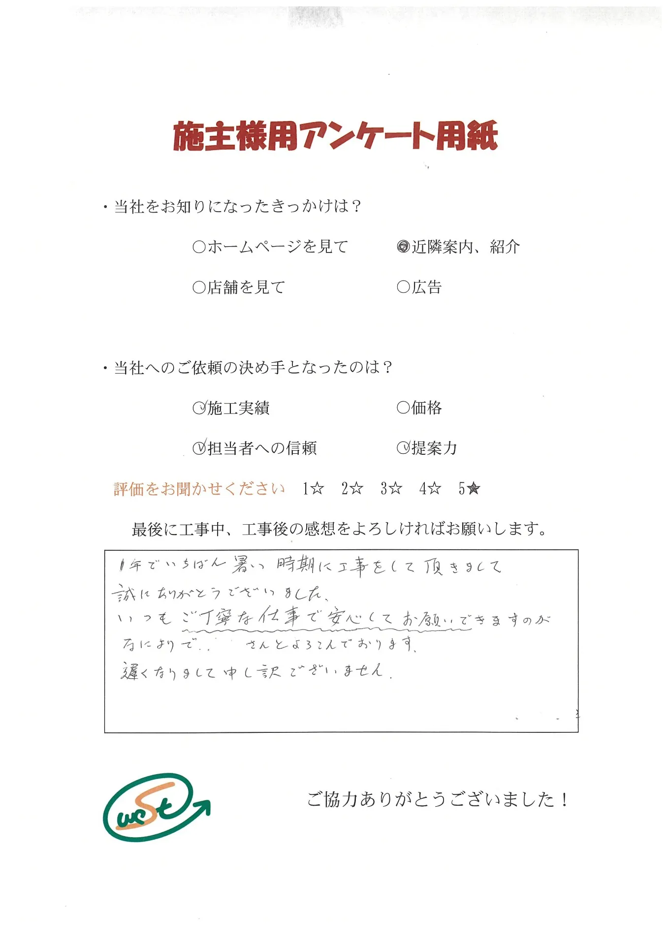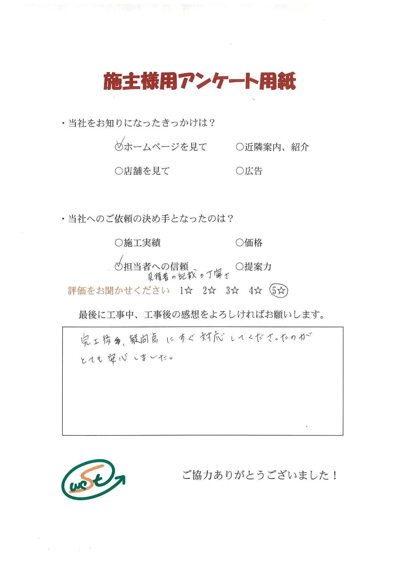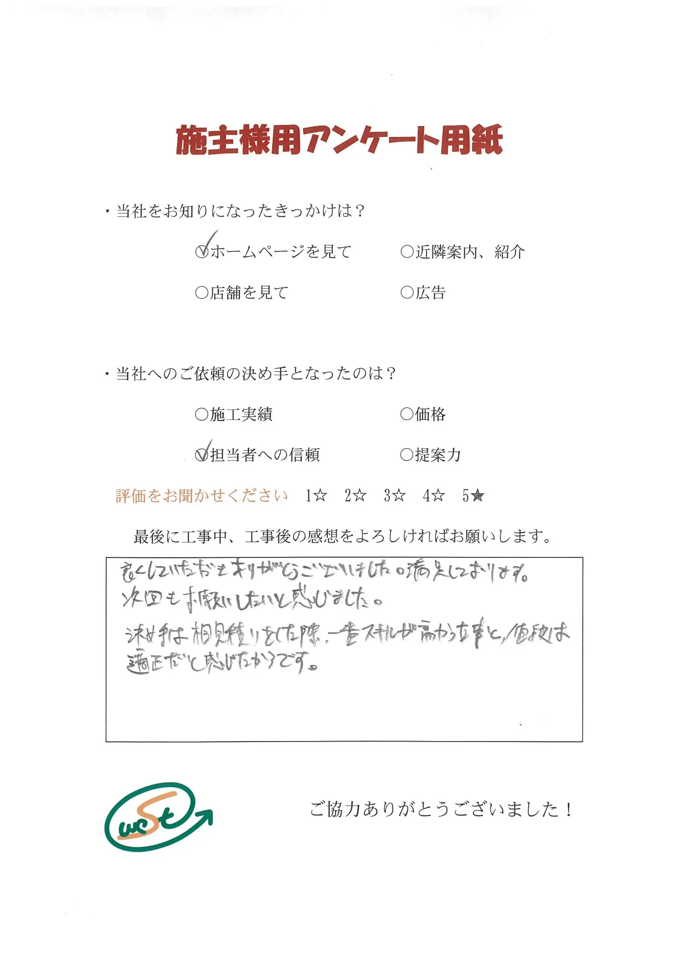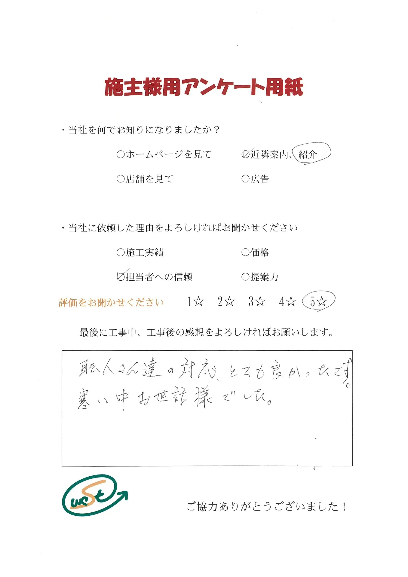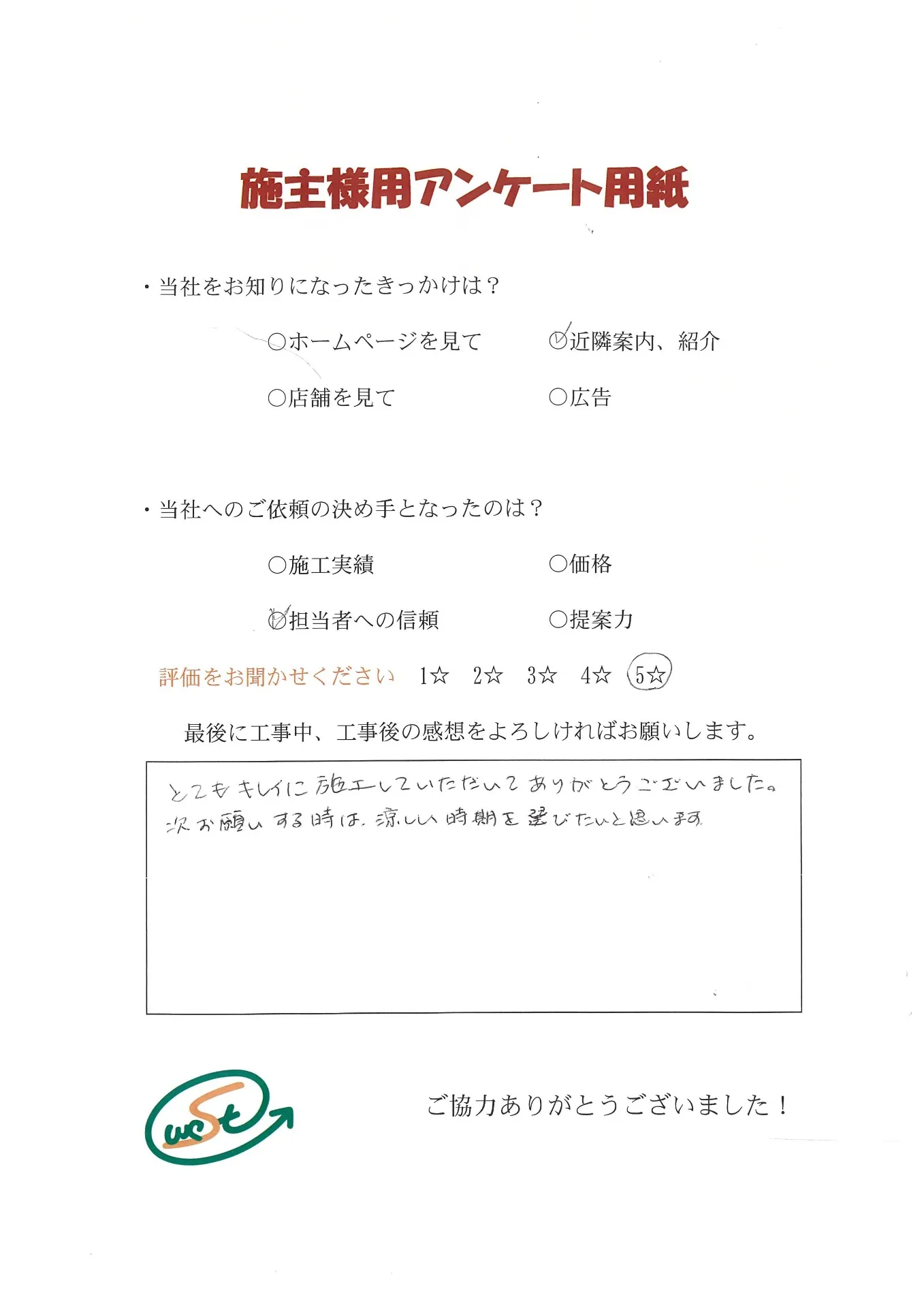 お客様から工事完了後のアンケート用紙をいただきました