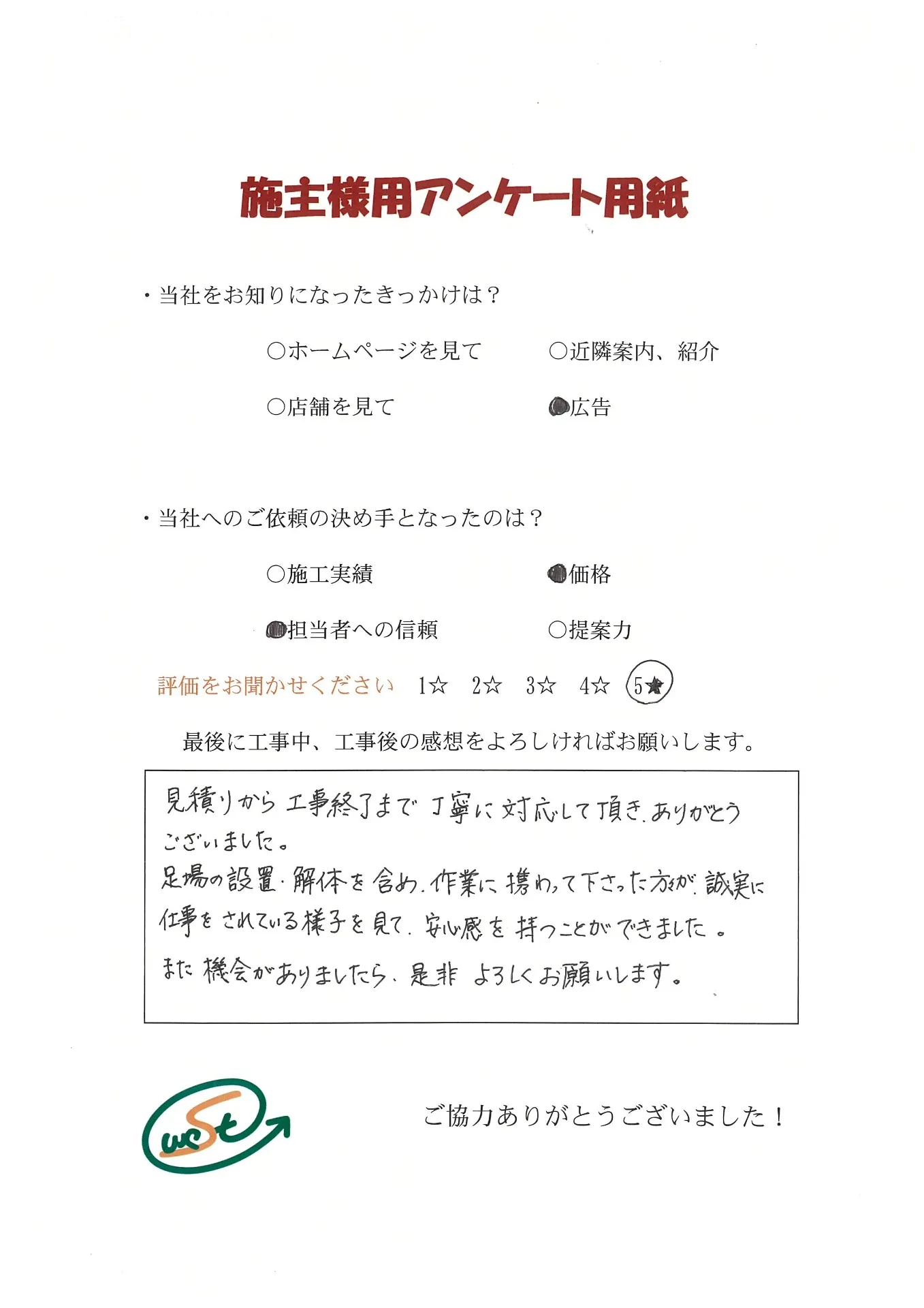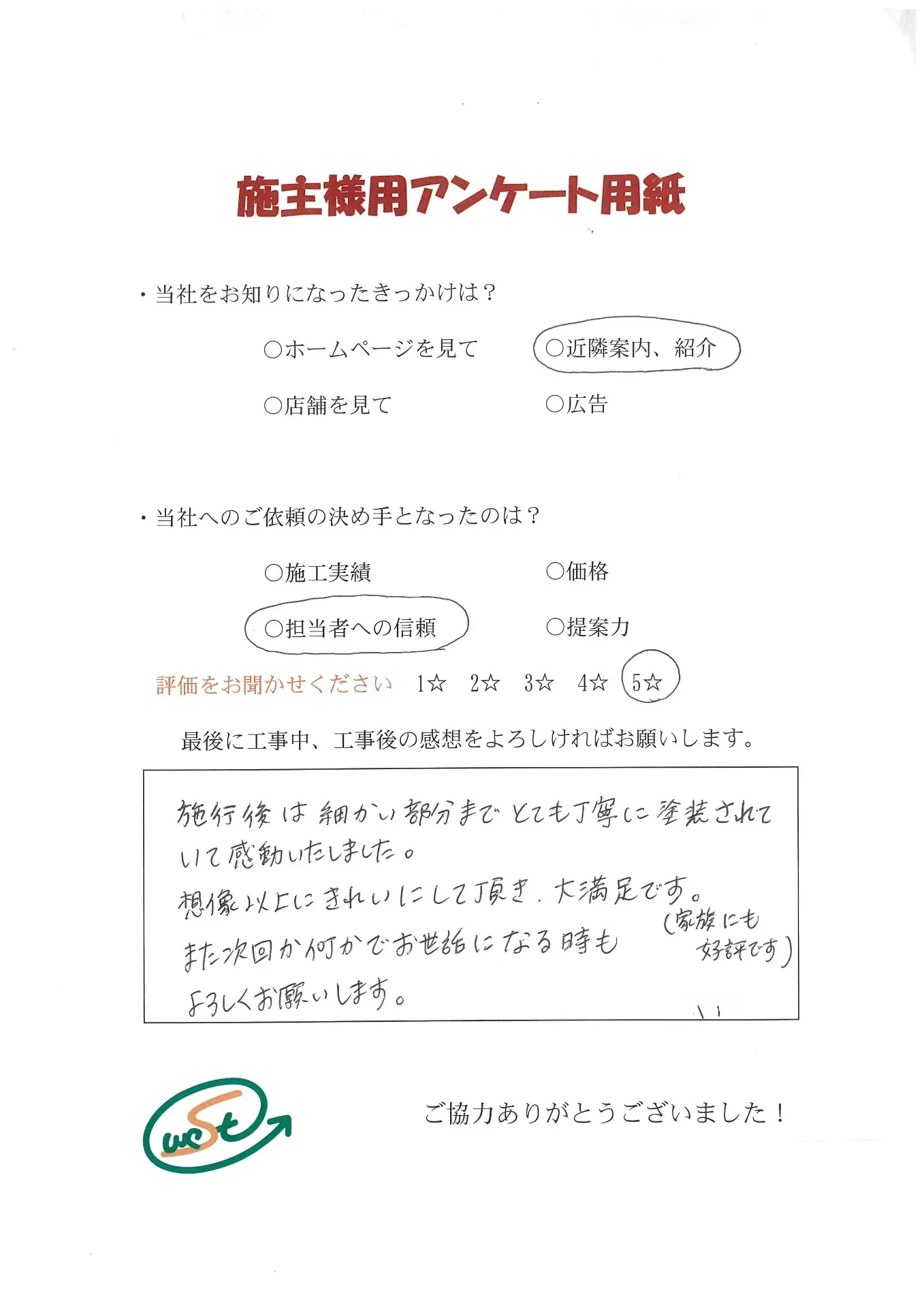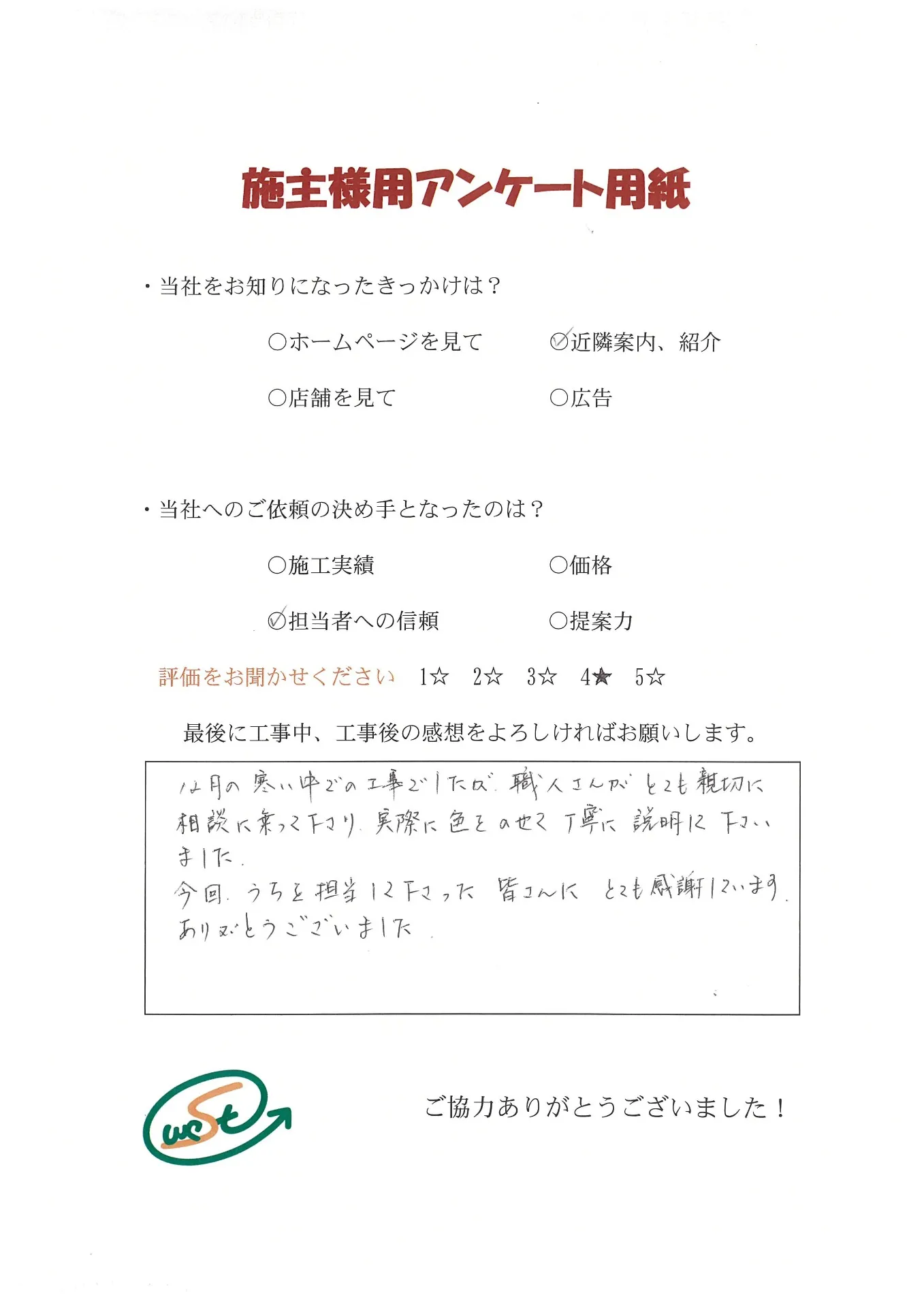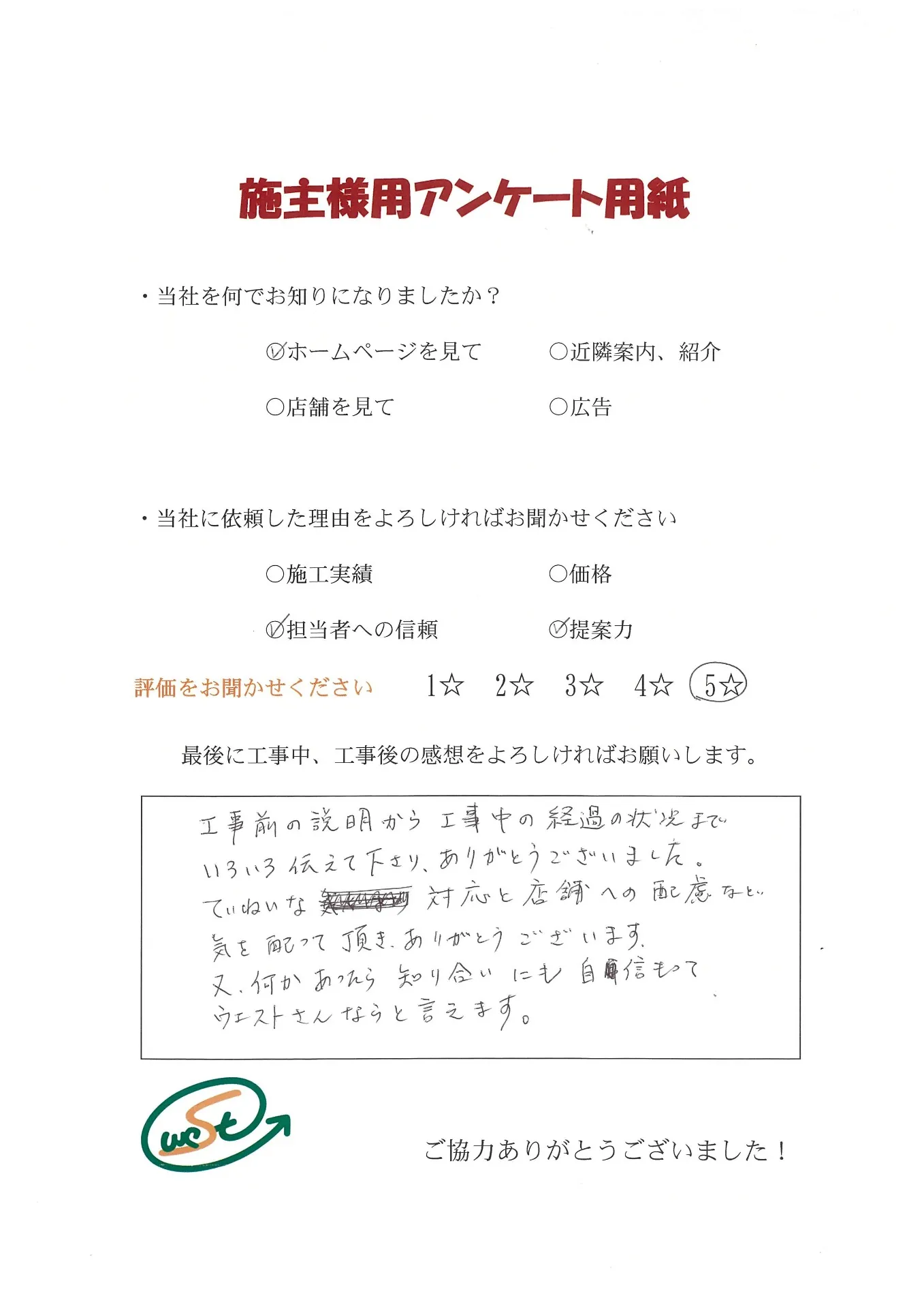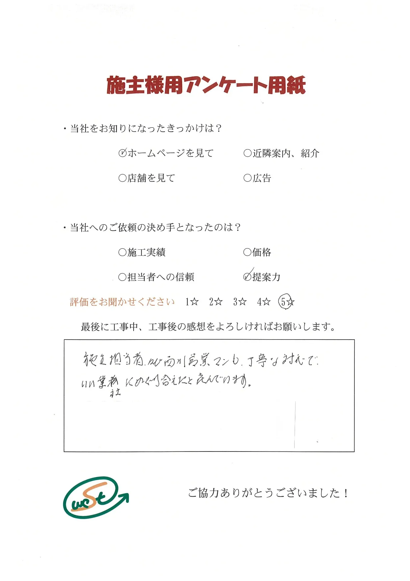 お客様から工事完了後のアンケート用紙をいただきました