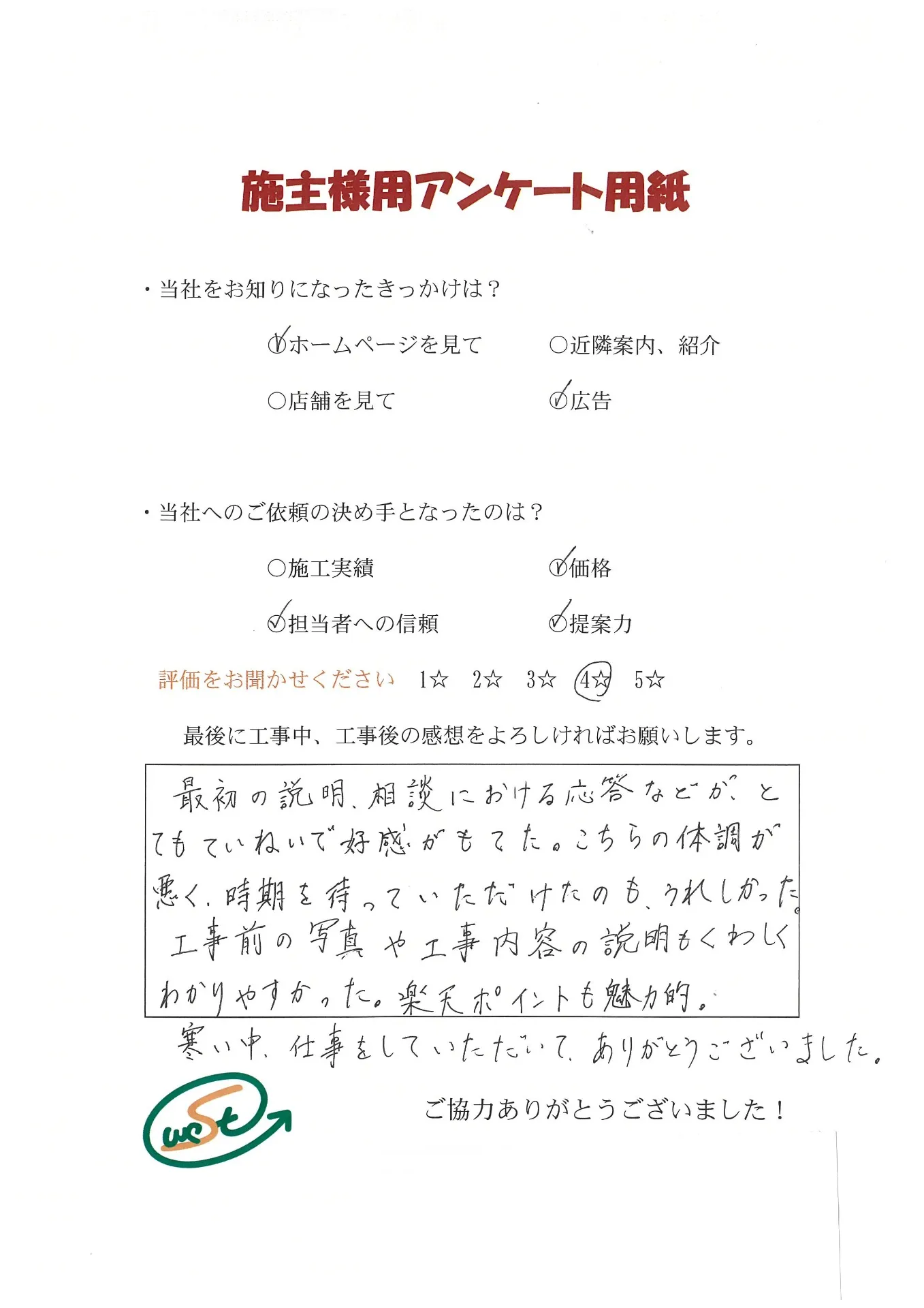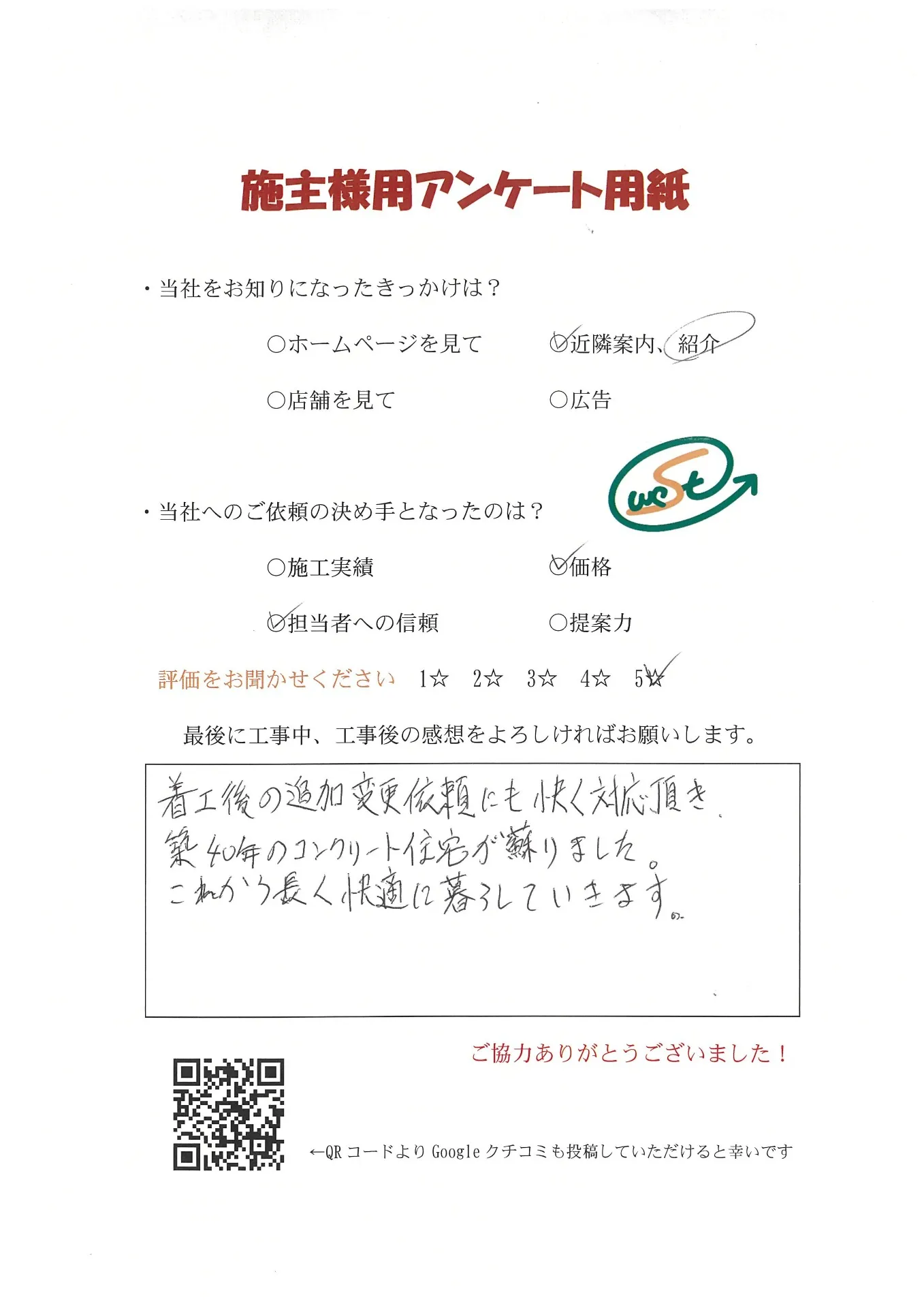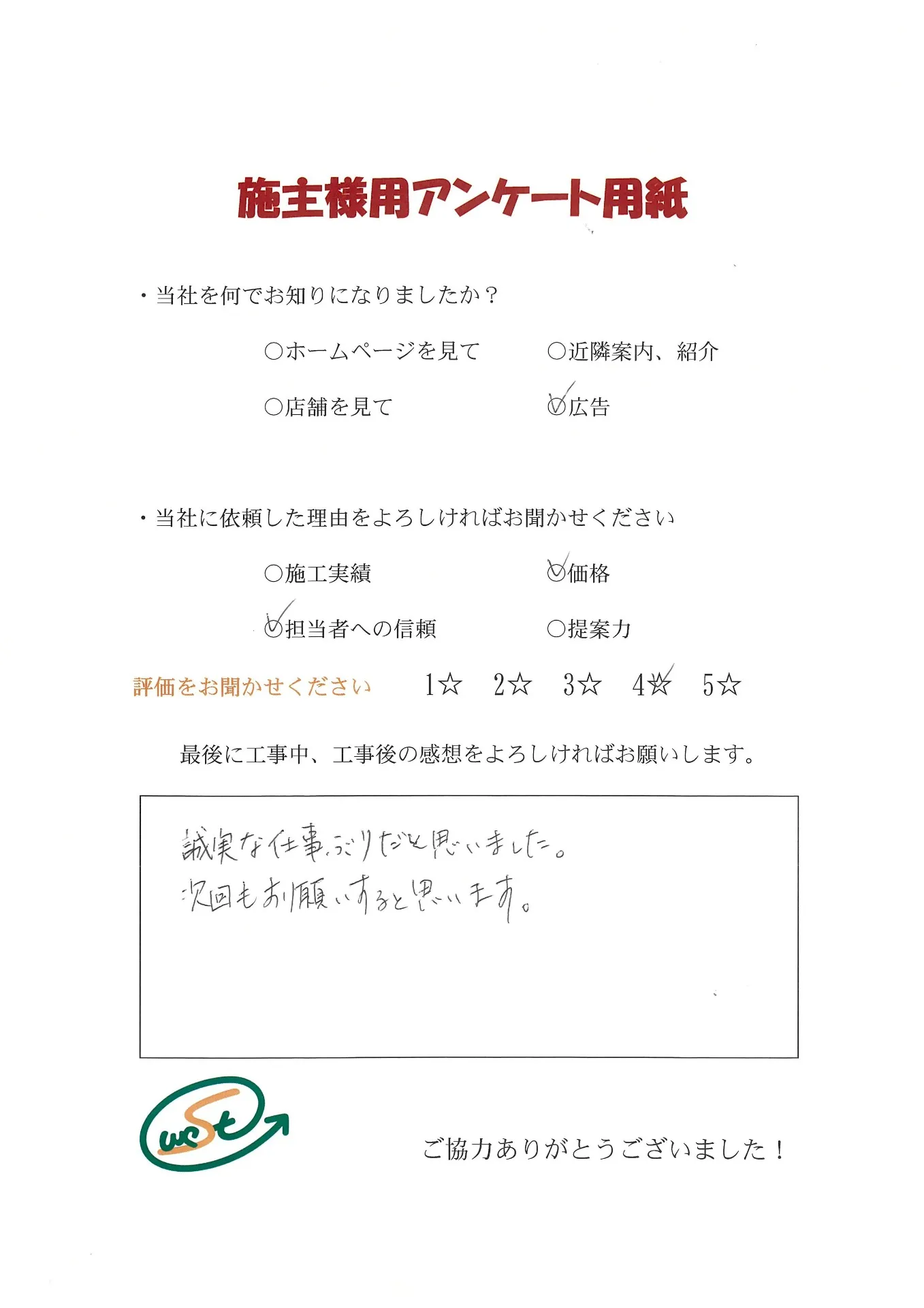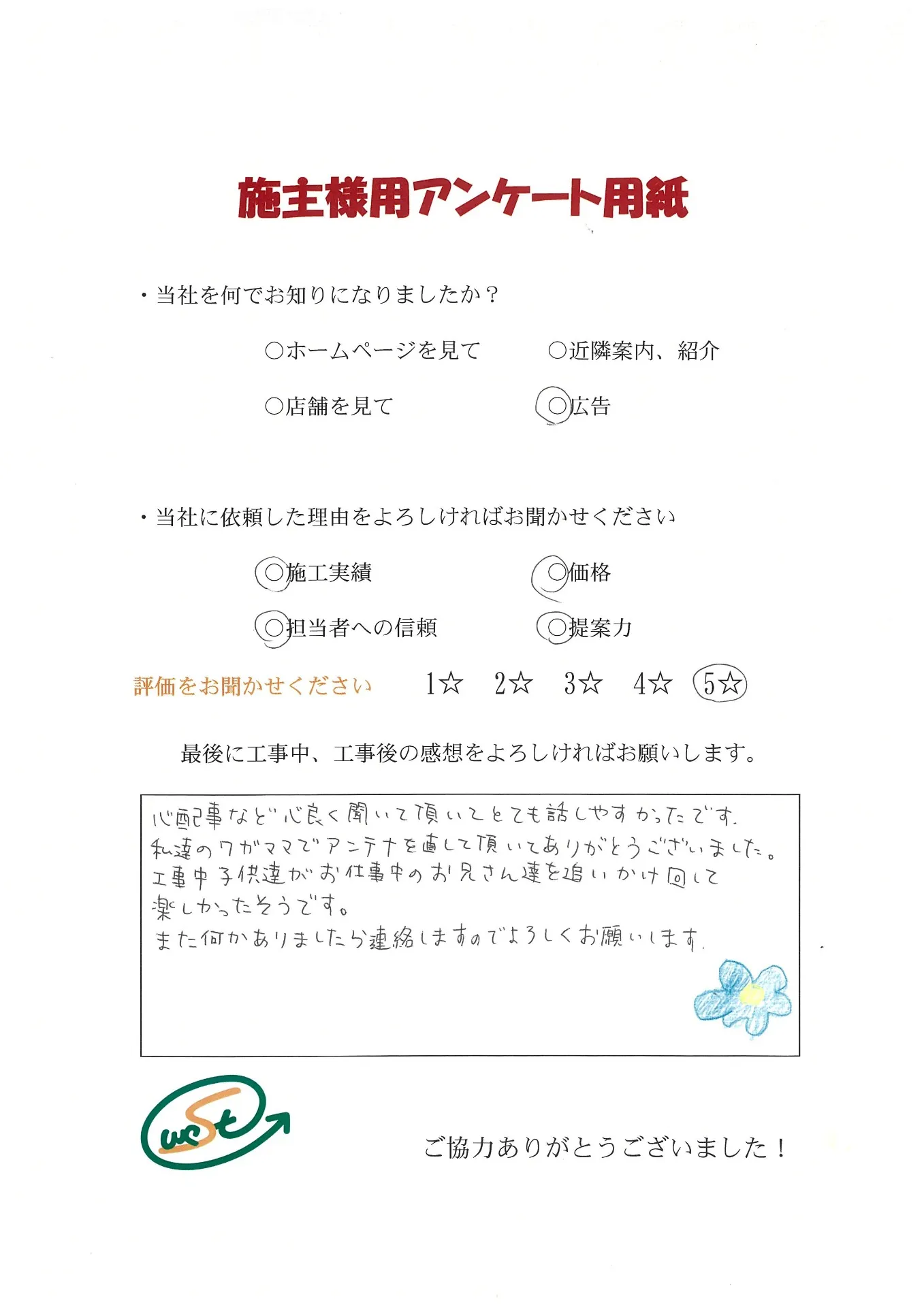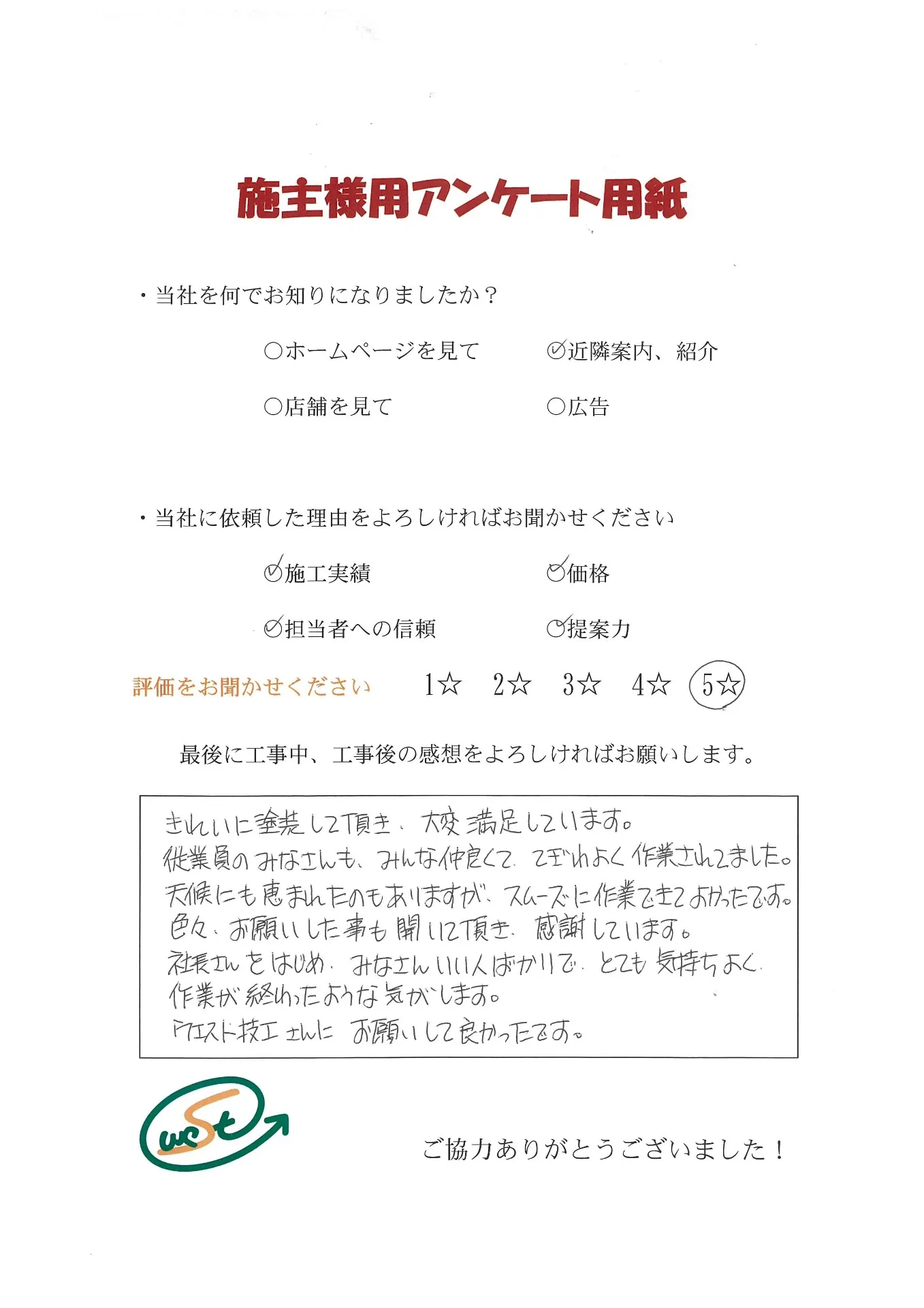 お客様から工事完了後のアンケート用紙をいただきました