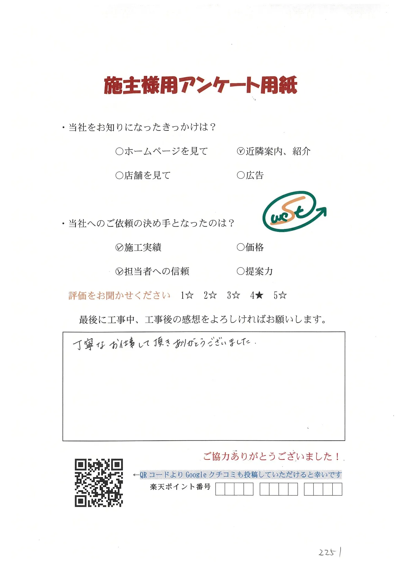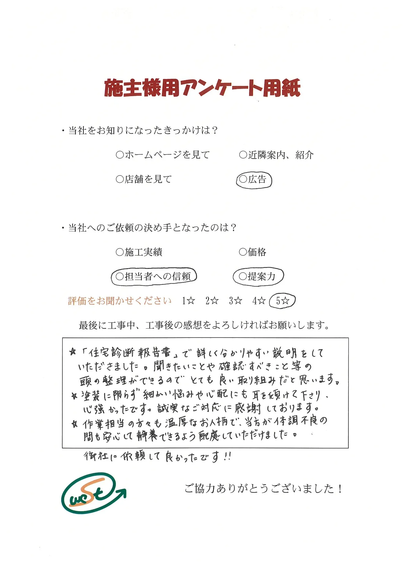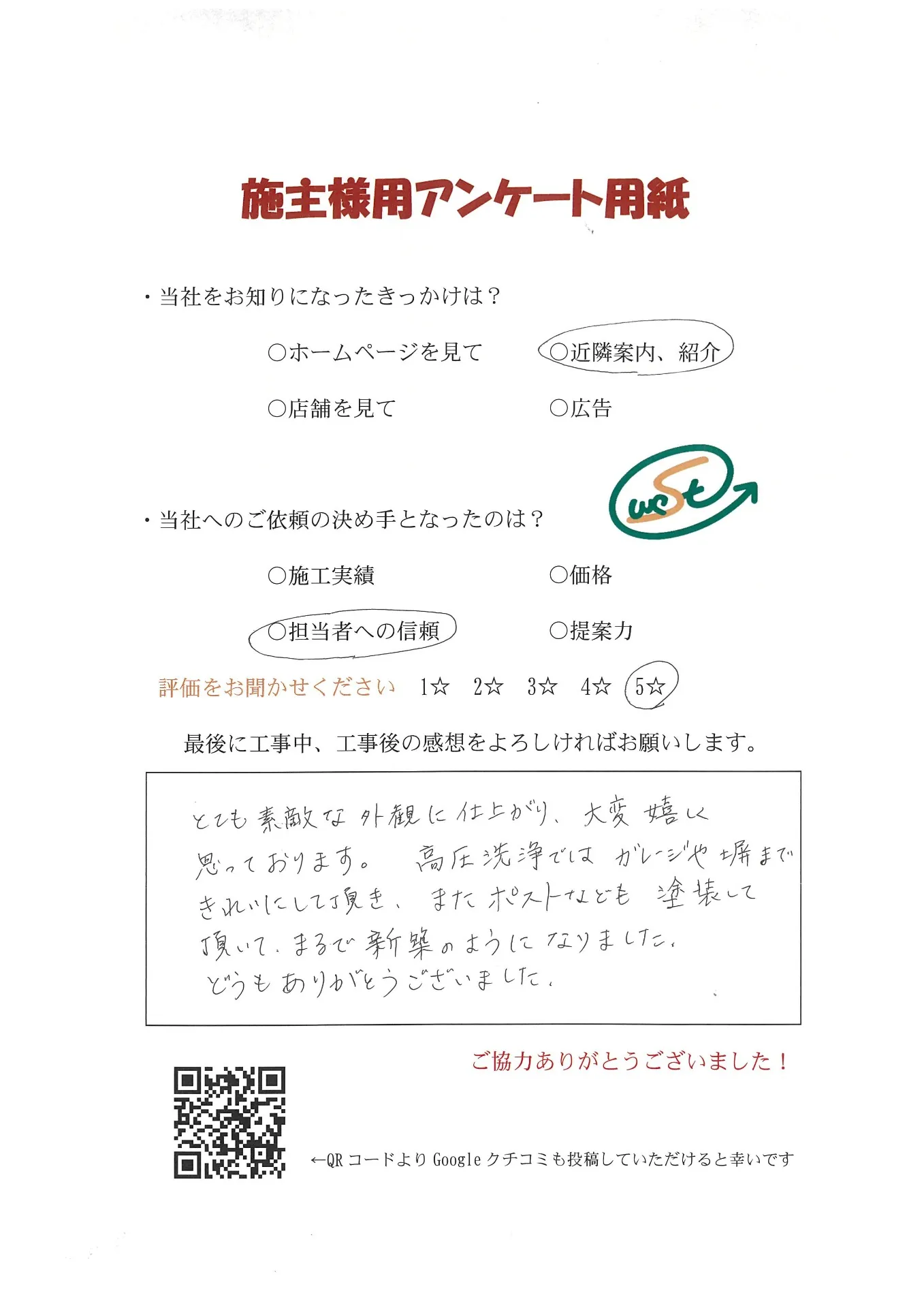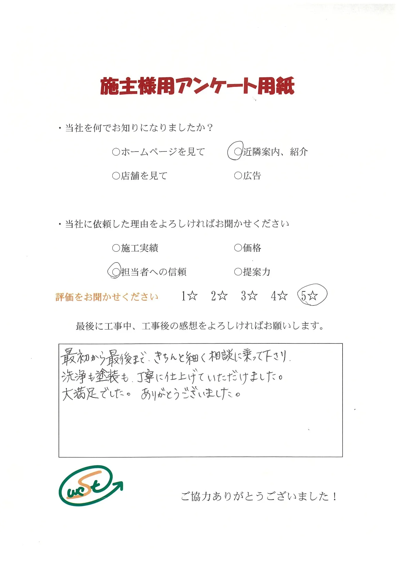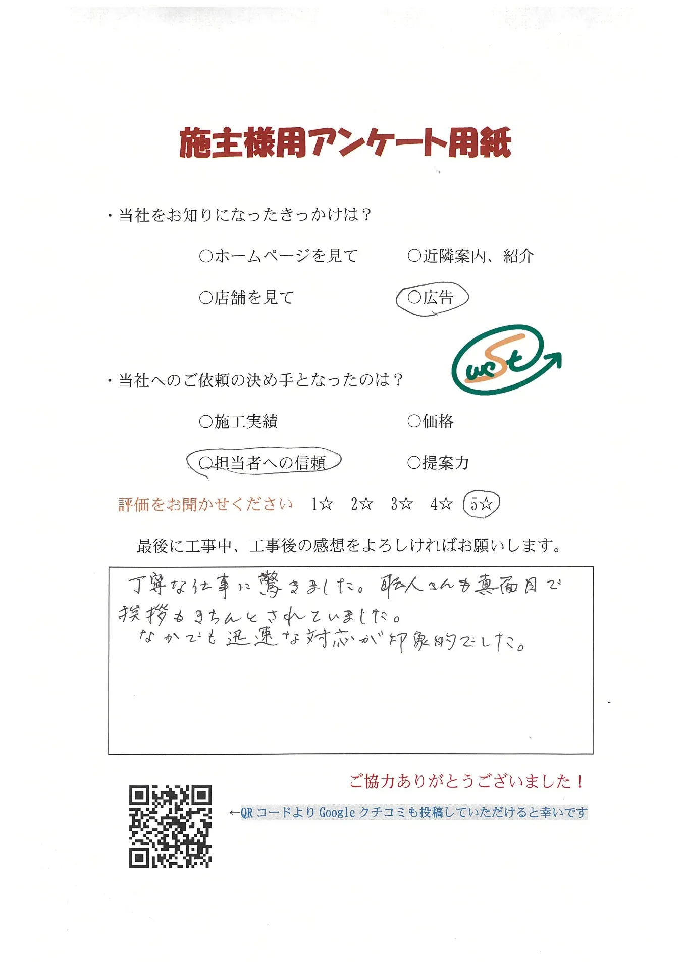 お客様から工事完了後のアンケート用紙をいただきました