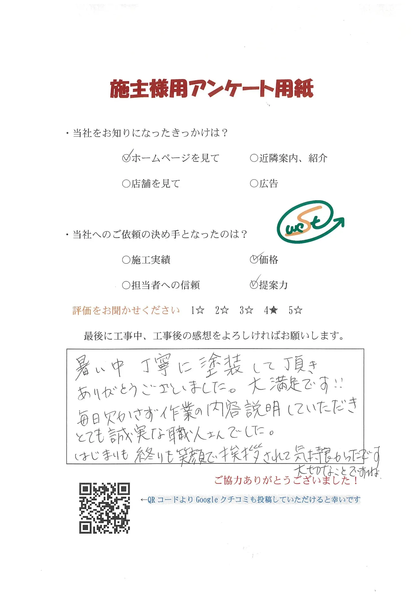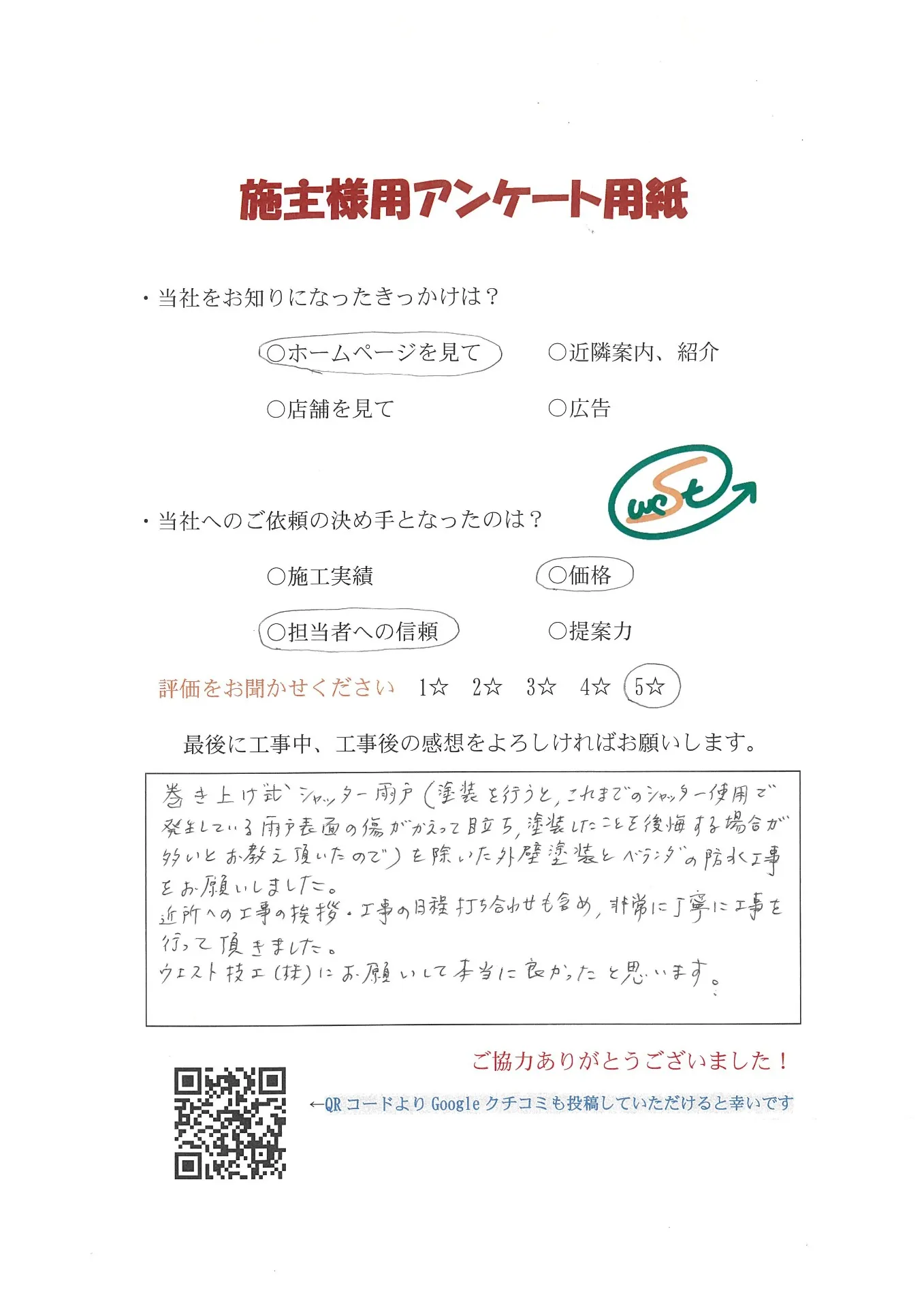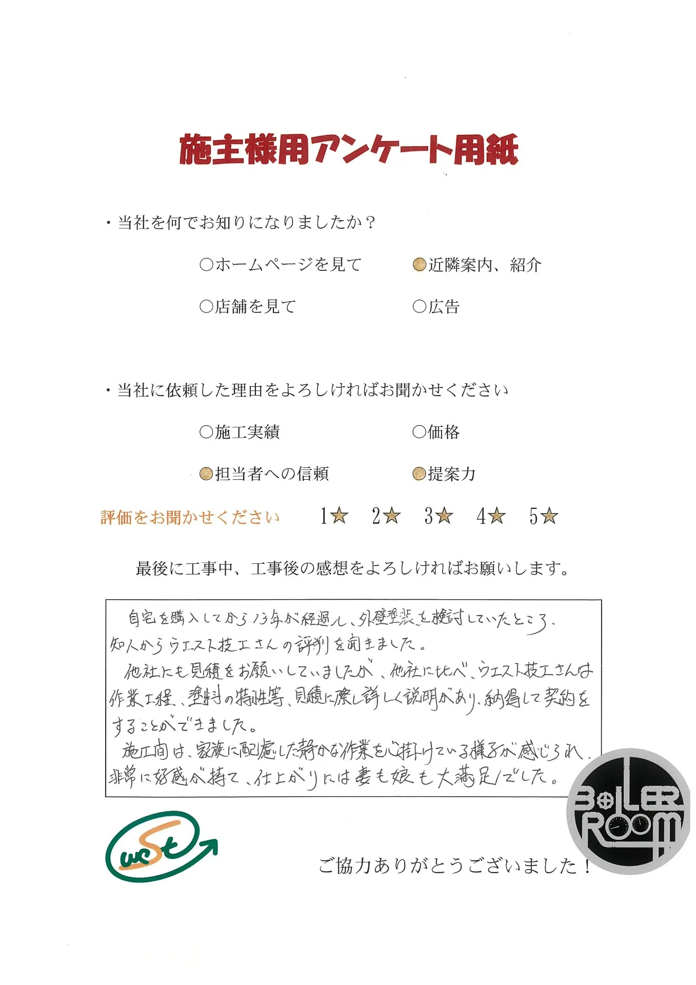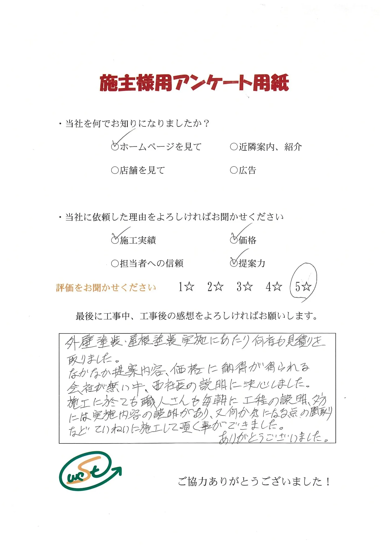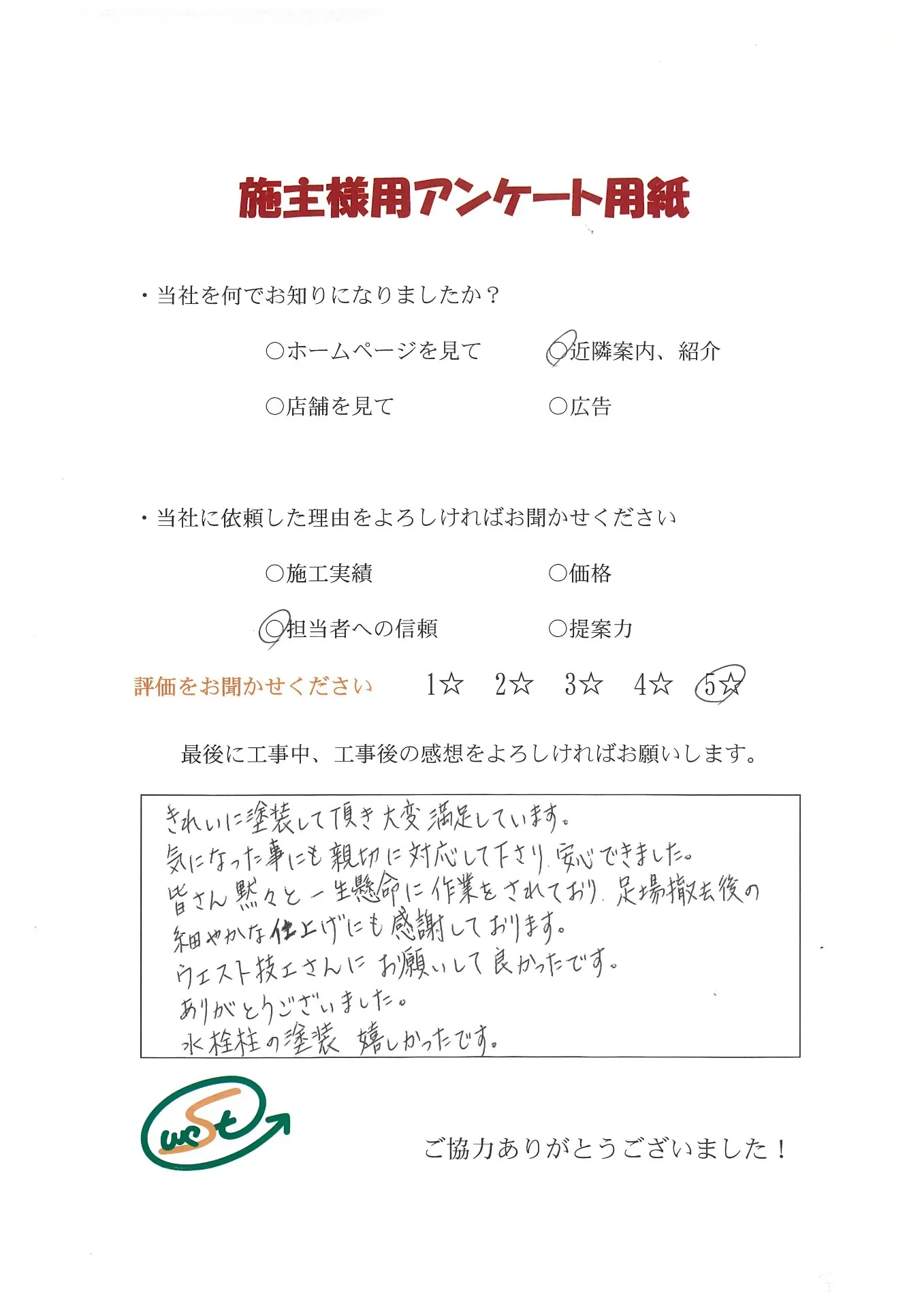お客様から工事完了後のアンケート用紙をいただきました