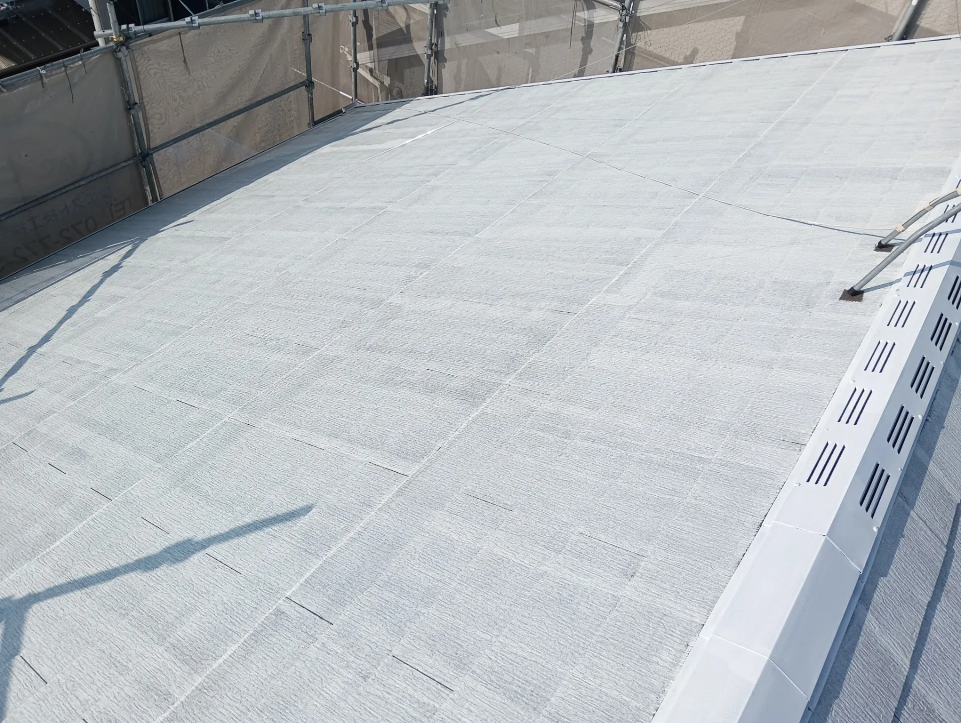 ビニール養生~外壁の下塗り塗装が終わり、現在は外壁の中塗り塗装を進めております