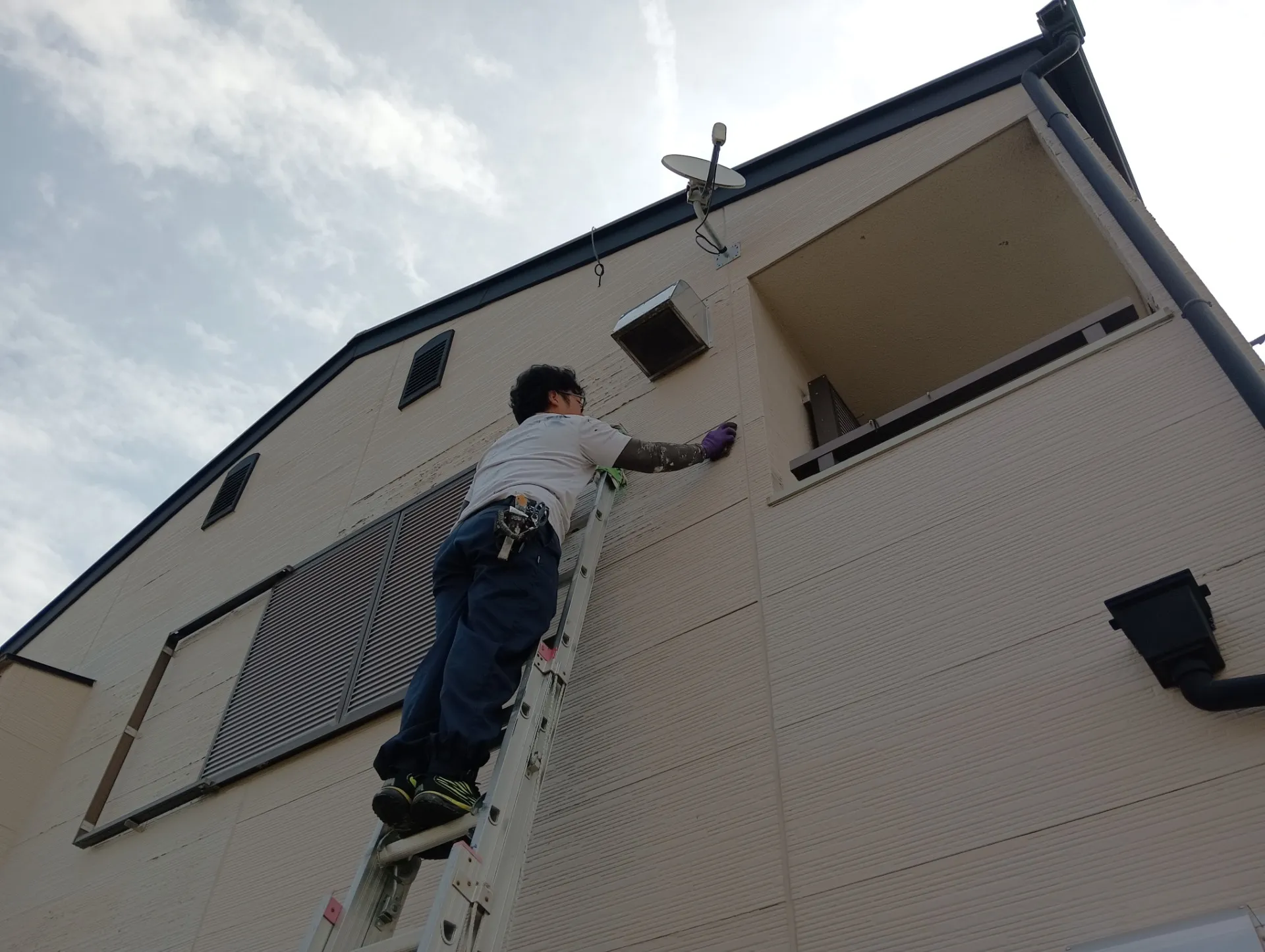 ひとまず梯子を使用して、塗膜が剥がれている部分に対して、建物の構造に適合した塗料で塗装を行う事にしました。 そしてしばらく様子を見て、問題が無ければ全体の外壁塗装を行う計画となりました