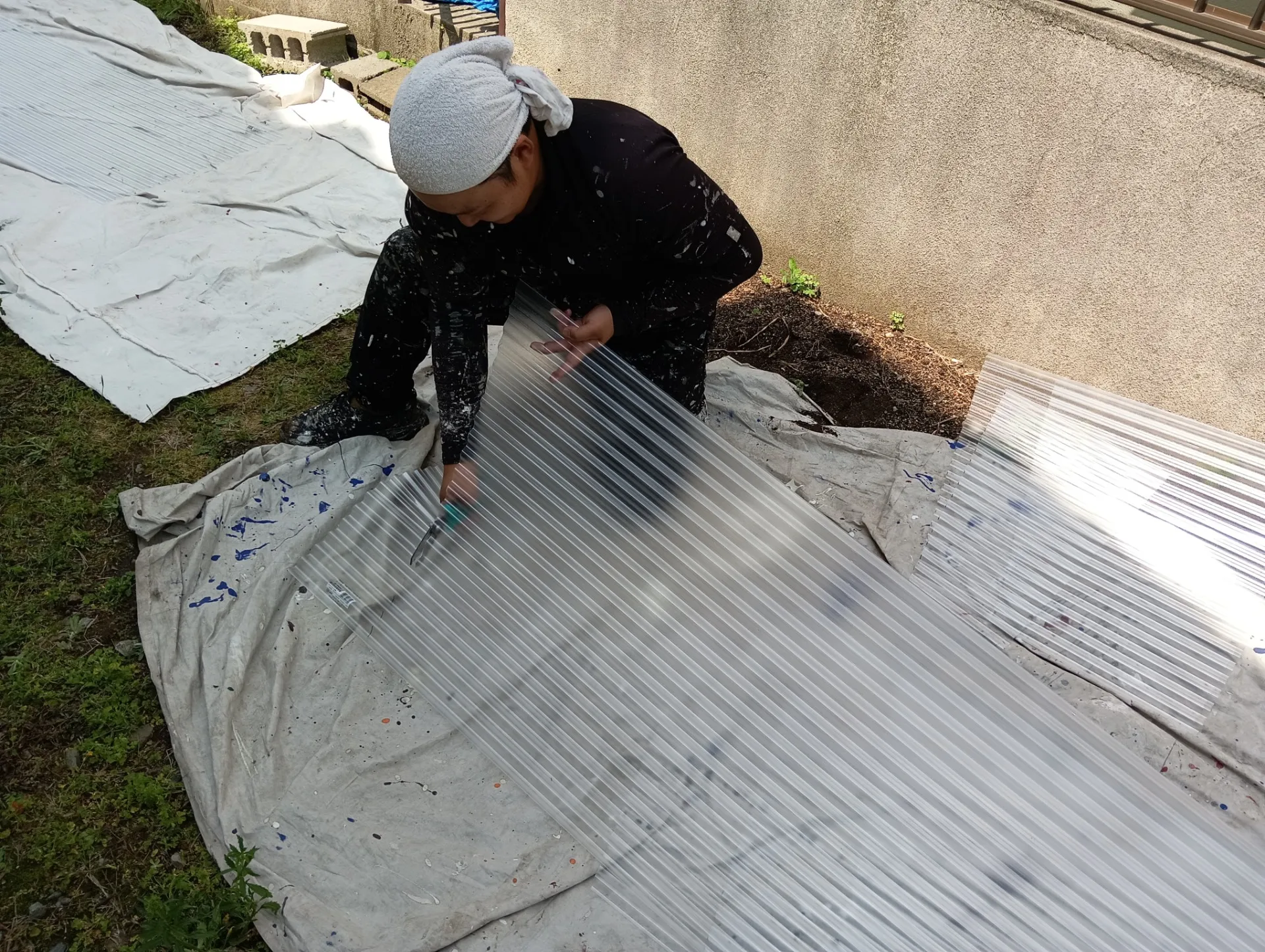 塗装作業と並行して、波板の張替え作業も進めていきます。耐久性に優れたポリカーボネートの波板に張替えます