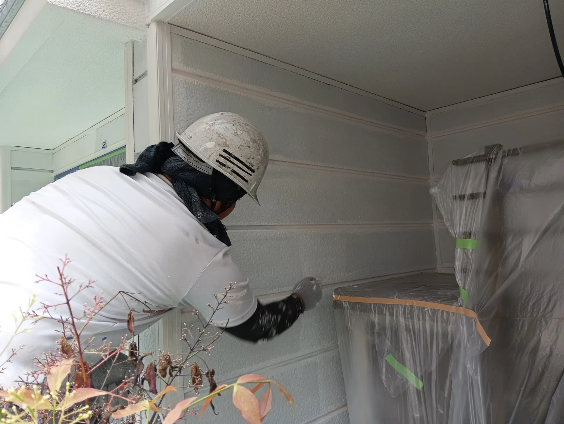 昨日に外壁の下塗り塗装が終わり、本日は外壁の中塗り塗装を進めております