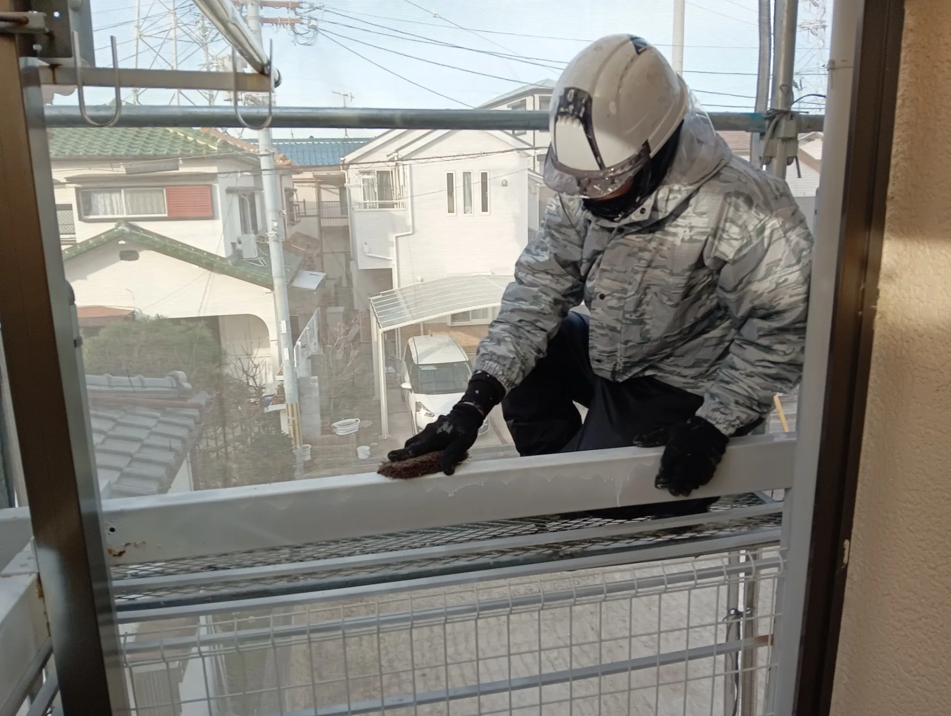 高圧洗浄を行う前に、剥がれかけている塗膜を取る為にケレン作業を行います。塗膜が浮いている部分が多かったので、ケレンと高圧洗浄にて微弱な塗膜をできる限り除去していきます