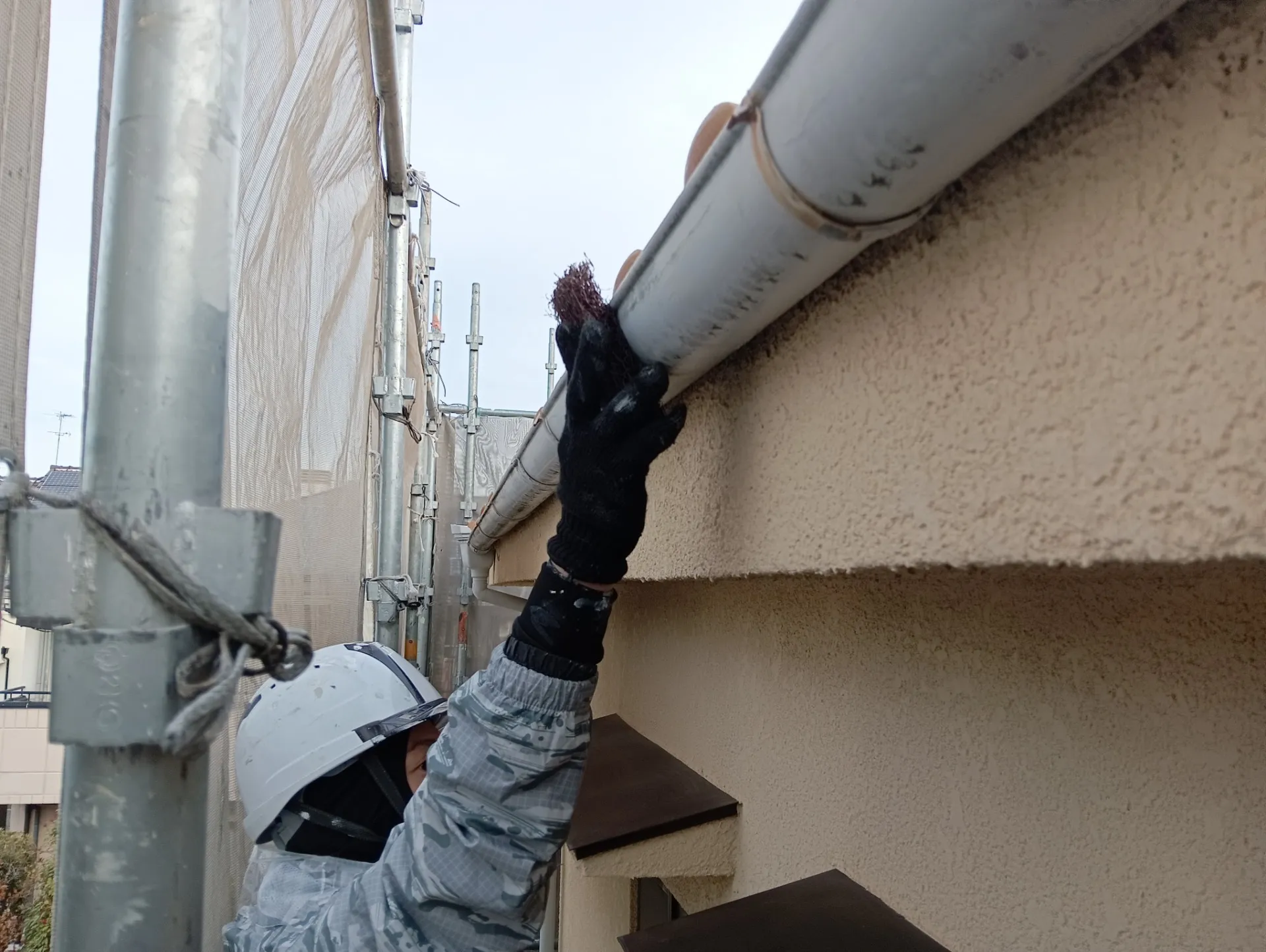 先日の足場工事が終わり、本日は高圧洗浄の作業を進めております