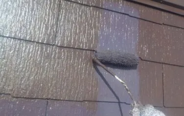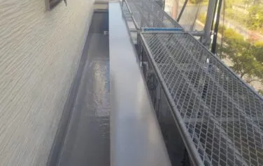 FRP防水も綺麗に塗り替えていきます。他には雨樋やシャッターBOXなどの付帯部分も塗り替えて塗装工事は完成です