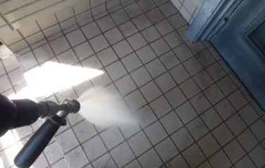 最後に玄関のタイルも洗い流します