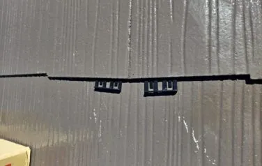 屋根の中塗り塗装が終わり、縁切り部材のタスペーサーを挿入していきます。屋根材が反っていない時に必要な作業工程です