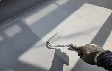 ベランダのFRP防水の塗り替えも3回塗りが基本です。中塗り塗装が終わり上塗り塗装を行います