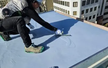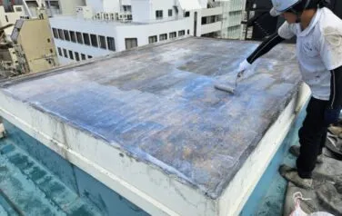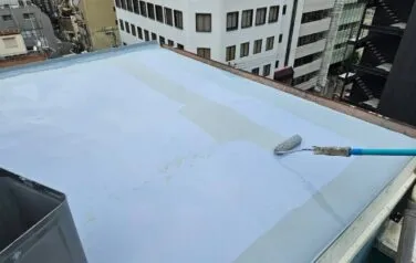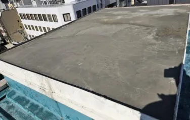 既存の防水がシート防水で、劣化が進行して既に雨漏りが発生している場合は、一度シートを撤去する必要があり、その場合何も雨水を防ぐ物が無くなってしまいますので、いつもよりも天気を気にしながら作業を進めなければいけません。無事に雨の影響も受けず防水工事を終える事ができました。
