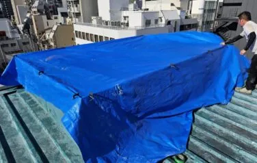 乾燥期間の間に雨が降ると雨漏りが発生してしまいますので、ブールーシートで雨養生を行いました