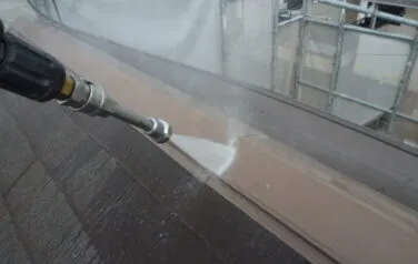 屋根の高圧洗浄です。屋根は特に汚れが蓄積しておりますので、しっかりと時間をかけて洗い流します