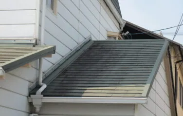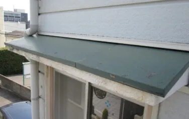 鉄製庇の上塗り塗装です。外壁と屋根の塗装工事が終了すると、次は付帯部分の塗装へと進みます