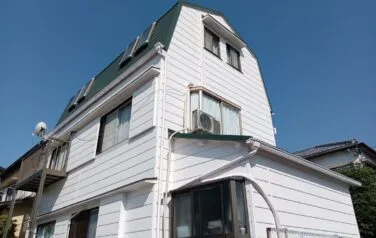 珍しい形のご自宅で、白色の外壁と緑色の屋根がご自宅の雰囲気にぴったりと合っていて、凄くオシャレで可愛らしい仕上がりとなりました。シリコン樹脂塗料の中でも非常に耐久性に優れた塗料を使用しておりますので、長期間綺麗な外観を維持できるかと思います。