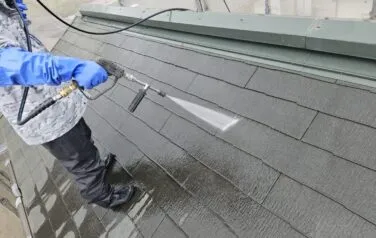 屋根の高圧洗浄です。長年蓄積した汚れを綺麗に洗い流していきます