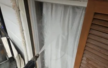 窓ガラスの高圧洗浄です。塗装箇所以外の部分も洗浄を行います
