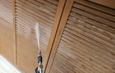 木製雨戸の高圧洗浄です。この時点で出来る限り劣化している塗膜を洗い流していきます