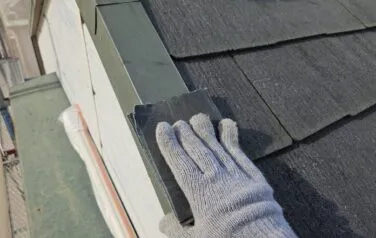 屋根板金の下塗り塗装です。ケレン作業が終わると錆止め塗料を塗装していきます