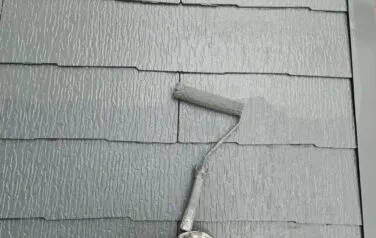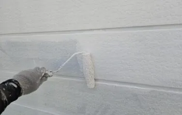 外壁の中塗り塗装です。細い溝部分以外はローラーで塗装を行います