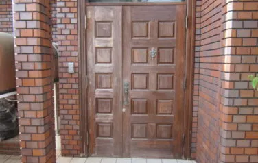 しっかりとした重厚感がある木製玄関扉の塗装工事のご依頼を頂きました。塗り潰しではなく、木目を生かした仕上がりをご希望されておりましたので、特殊な剥離剤を使用して既存の塗膜の除去を行い、一度元々の木の状態に戻してから慎重に色付けを行いました。
