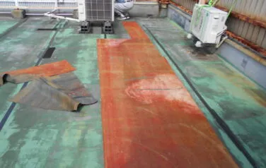 既に雨漏りが発生していた事もあり、屋上の防水工事のご依頼を頂きました。既存のシート防水の劣化が激しかった為、最初に全てのシートの撤去を行い、その後に通気緩衝という湿気を逃がす事ができる工法にて防水工事を行いました。
