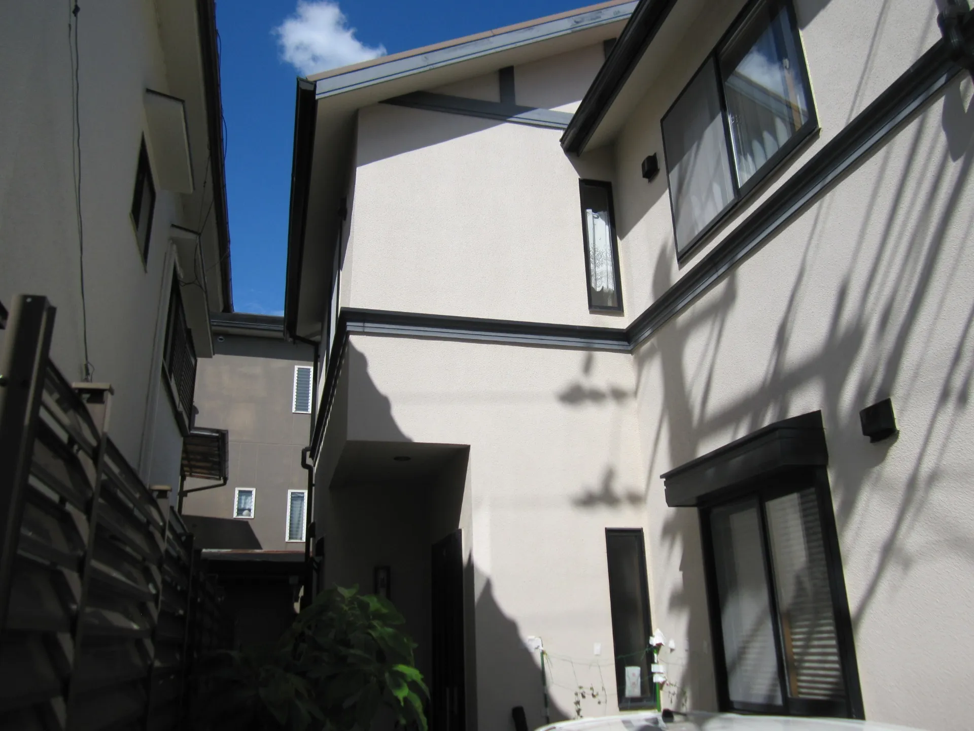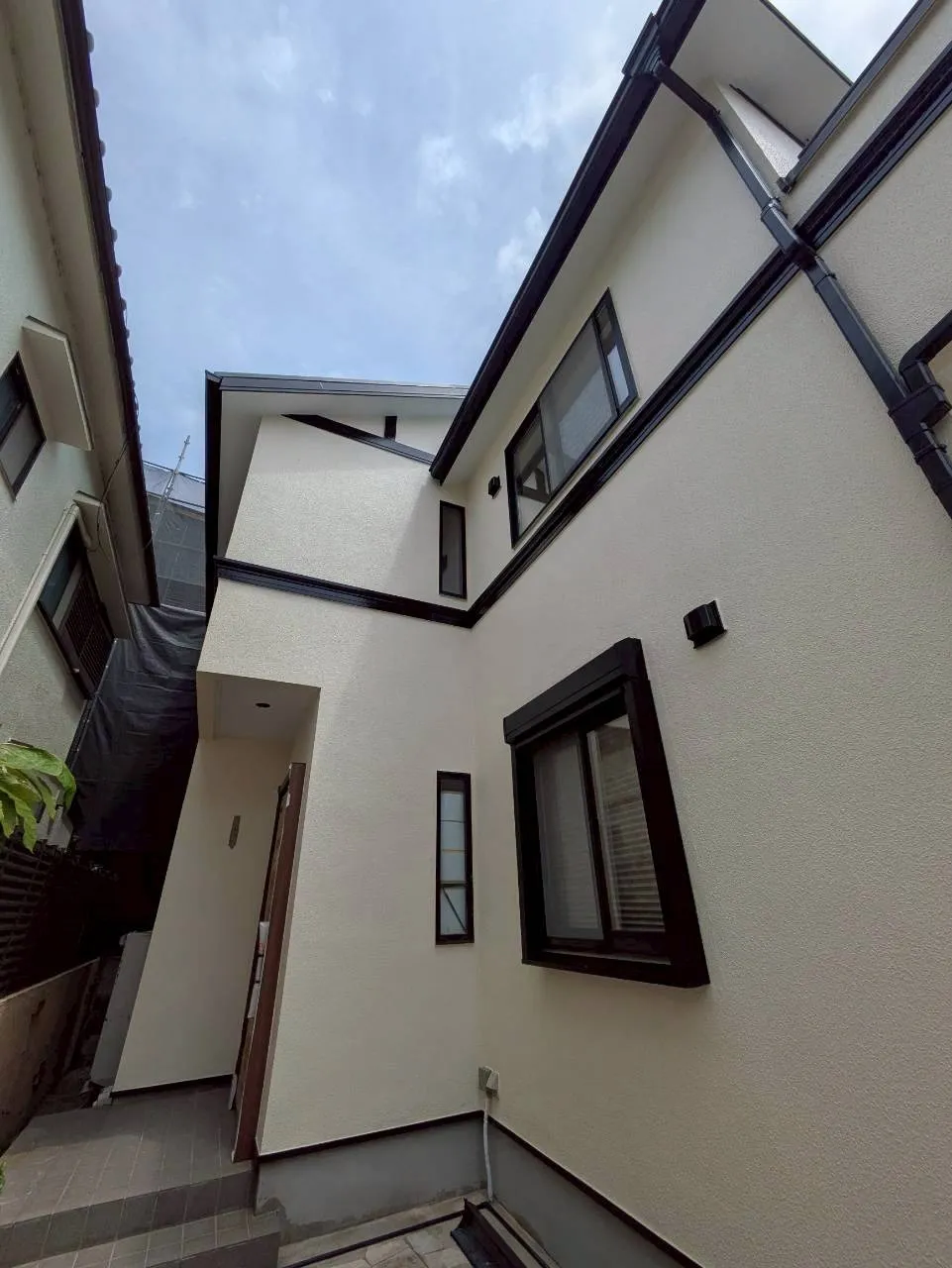 白系統の外壁色と付帯部分の黒色の2色の組み合わせが、凄くシンプルながらかっこいい仕上がりとなりました。