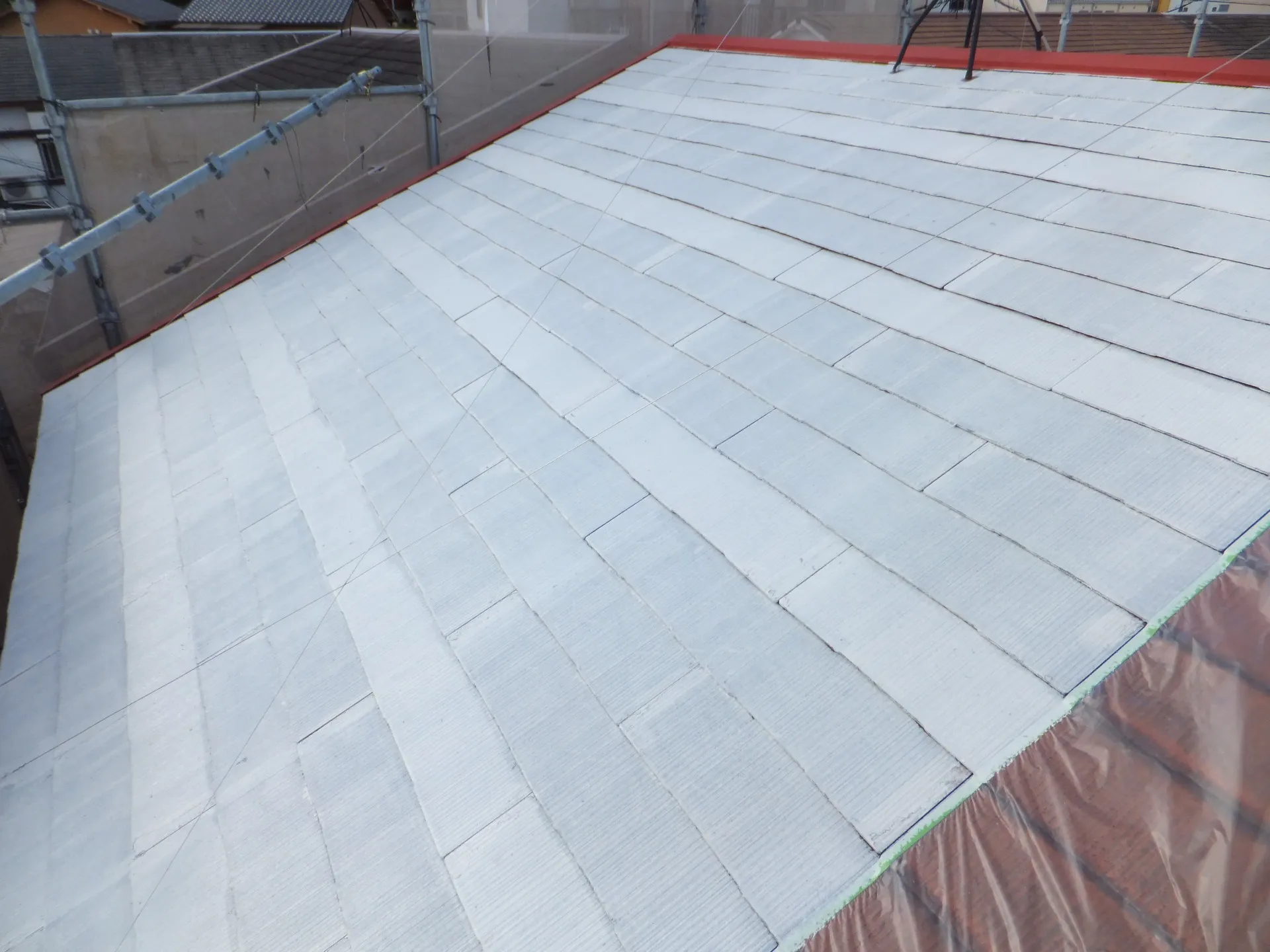 兵庫県川西市F様邸 屋根の下塗り塗装を進めております 屋根の下塗り塗装を行いました。最近は急に雨が降ってくる事が多い為、屋根に関しては特に塗装のタイミングが重要です並行してビニール養生作業も完了しております